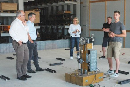 „Wir können hier sowohl an einem Stahl- als auch einem Holzunterzug testen, die Deckenfläche variabel verkleinern oder vergrößern. Das ermöglicht es uns viele verschiedene Konstellationen und Szenarien auszuprobieren“, erläutert Johannes Ruf. Der Versuch selbst läuft dann immer nach einem bestimmten Muster ab, wie Valentin Knöpfle erklärt: „Wir beginnen mit dem sogenannten Heel Drop, also dem Wippen von den Zehenspitzen auf die Ferse. Dann folgt das Joggen auf der Stelle. Auf der Decke sind verschiedene Messpunkte angebracht, über die wir dann die ausgelösten Schwingungen auswerten können.“ Im Laufe der Testphase konnte mit den im Vorfeld angedachten und berechneten Konstellationen kein zufriedenstellendes Ergebnis erzielt werden. Kurzerhand entwickelte das Team zusätzliche Schwingsungsdämpfer und baute sie ein. „Damit konnten wir die Schwingungen der Decke deutlich reduzieren, wenn auch nicht ganz stoppen“, so Patricia Hamm. Der Prüfstand wird nun abgebaut und die detailierte Auswertung der Messergebnisse beginnt. Die erste Masterthesis zu dem Thema wird bereits in diesem Sommer veröffentlicht, der abschließende Projektbericht folgt im Juni 2023.