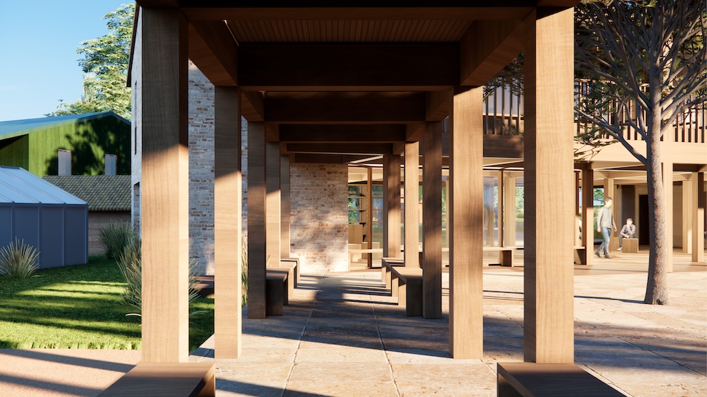 Der bestehende Buchladen, der in einer alten Steinscheune untergebracht ist, wird renoviert und erweitert. Als einladendes soziales Herz des Oberen Hamlets von Plum Village gedacht, wird dort, wo die dicken Steinmauern der Scheune zuvor die Funktion des Gebäudes verdeckten, eine überdachte Terrasse Raum zum Sitzen, Lesen und für soziale Begegnungen bieten, während vergrößerte Türöffnungen die Menschen ins Innere einladen. Der einst beengte und unübersichtliche Raum wird mit einem einfachen, modularen Holzregalsystem ausgestattet, um die Bücher, Kalligrafien und weiteren Gegenstände des Klosters besser zu präsentieren.