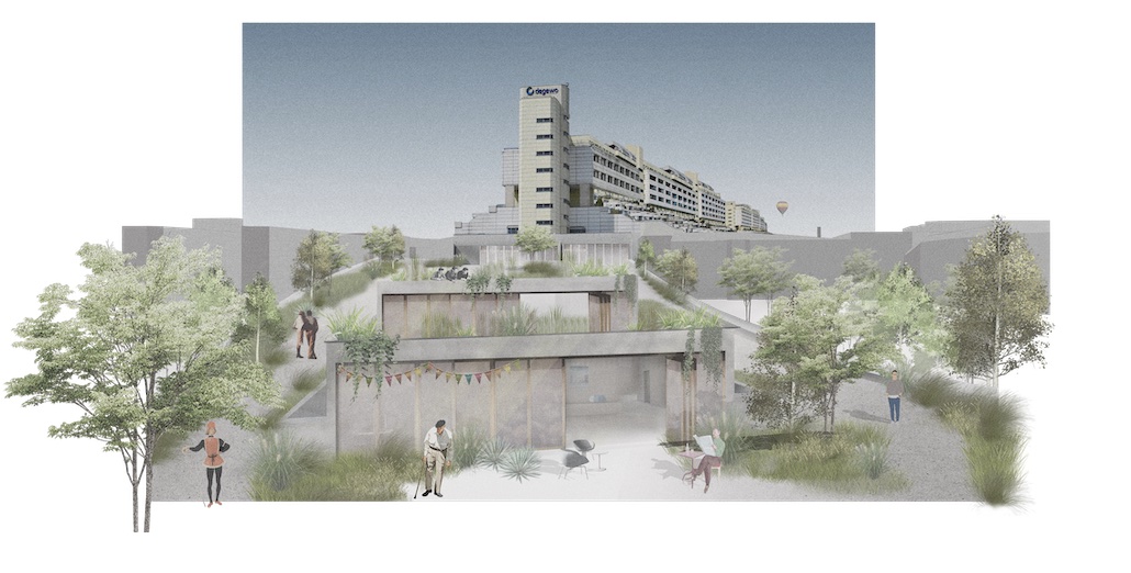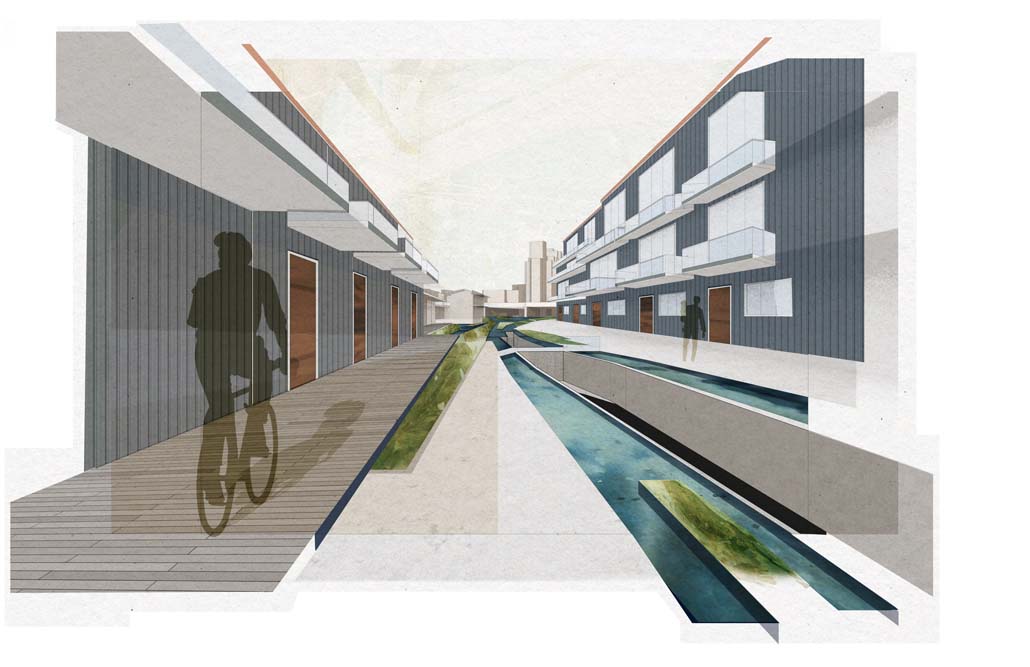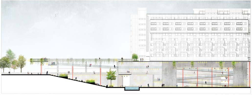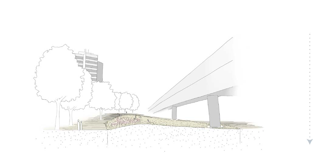Eingegangen waren über 100 Beiträge von jungen Planer*innen, von denen 13 Arbeiten ausgezeichnet wurden. Gerber und Abée: „Besonders lebhaft hat die Jury die Arbeit ´AufKläranlage´ diskutiert. Sie skizziert einen überraschenden Lösungsansatz für 150 Millionen Liter Abwasser, das jährlich in der Autobahnüberbauung Schlangenbader Straße anfällt. Die vorhandenen Autobahntunnel und Parkebenen im Inneren des Gebäudekomplexes werden zu einer Abwasser-Kläranlage umgewidmet. Auf dem Betontrog der Autobahnstrecke nach Süden bis zur Schildhornstraße soll ein artenreich bepflanztes Biotop zur Filterung des Grauwassers und zur Verdunstung und unmittelbaren Rückführung in das lokale Wassermanagement entstehen. Die drei Verfasser*innen ergänzen die städtebauliche Situation durch einen ´Blauen Campus´ für Studierende aus der nahegelegenen FU mit einer Mensa und einer Bibliothek, durch ein Informationszentrum und einen ´Wasserboulevard´.“