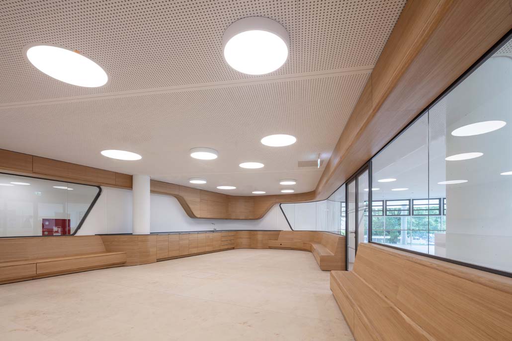 Auch die Gestaltung der Arbeitsbereiche ist Teil des architektonischen Gesamtkonzepts. Flexible Bürokonzepte mit Desk-Sharing, Working Cafés sowie Rückzugs- und Kommunikationszonen unterstützen agile Arbeitsformen. Die Anbindung an den öffentlichen Nahverkehr, E-Lademöglichkeiten sowie eine öffentlich zugängliche Sporthalle fördern die städtische und soziale Vernetzung.