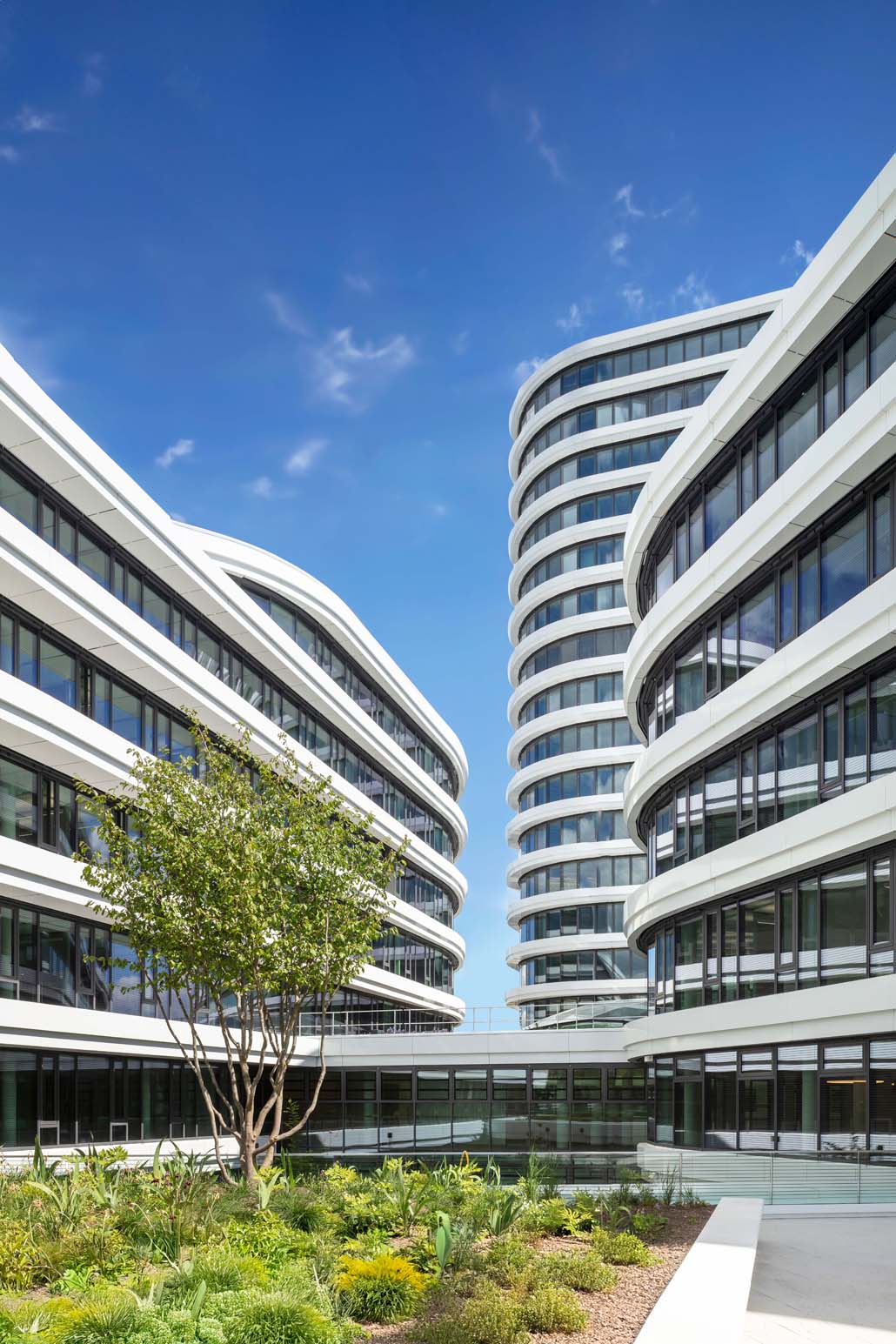 Das Ensemble besteht aus mehreren organisch geformten Solitärbauten, die sich um einen weithin sichtbaren, 17-stöckigen Hochpunkt gruppieren. Eine knapp 100-jährige Eiche markiert den zentralen Haupteingang auf der Plaza und bildet einen landschaftlichen Bezugspunkt im Zentrum des Campus.