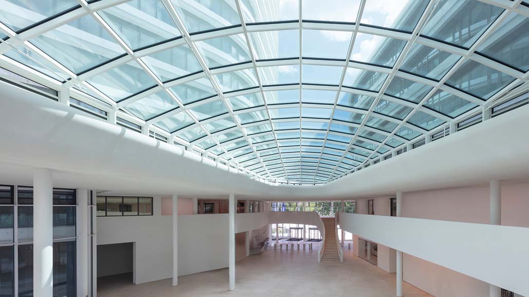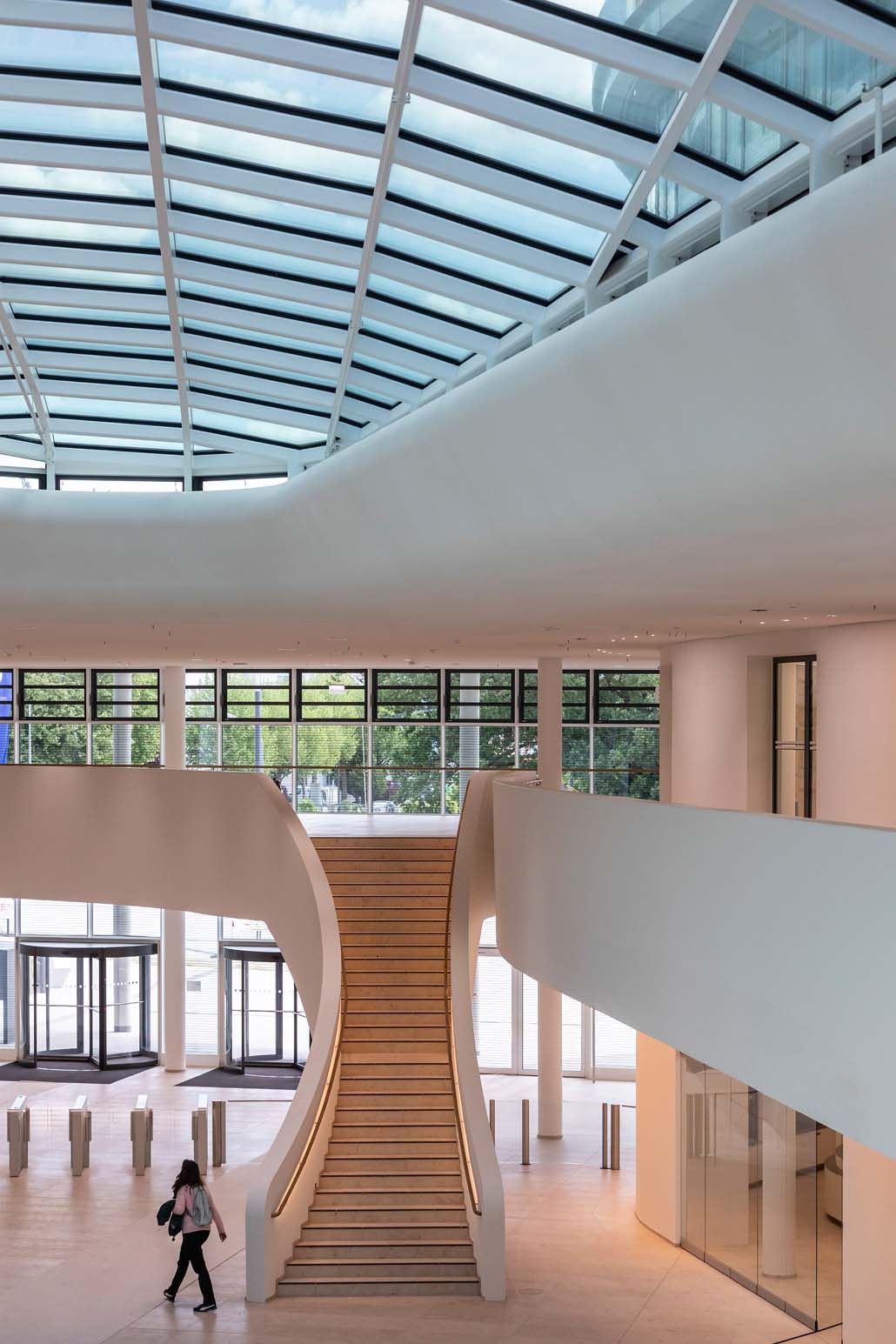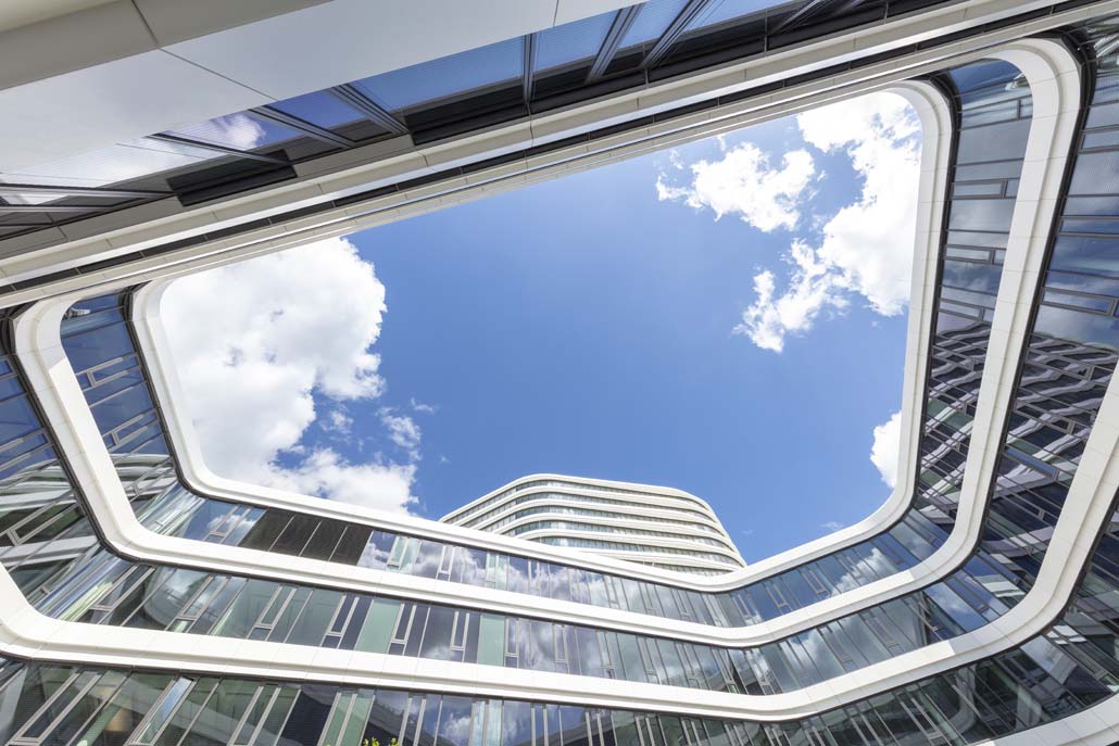 Die zentrale Plaza dient sowohl der Erschließung der einzelnen Nutzungsbereiche als auch als Veranstaltungsfläche. Eine gläserne Kuppel ermöglicht Blickbeziehungen zu den angrenzenden Gebäuden und erleichtert die Orientierung auf dem Campus. Begrünte Innenhöfe in den niedrigeren Baukörpern führen das Grün der Umgebung in das Innere weiter. In der 16. Etage des Hochhauses befindet sich die Sky Lounge mit Rundumblick auf Stuttgart und Umgebung.
