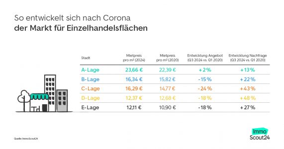 Die Corona-Pandemie und die damit verbundenen Lockdowns haben zu gesellschaftlichen und wirtschaftlichen Herausforderung geführt, die auch Auswirkungen auf den Markt für Gewerbeimmobilien hatten. Dieser entwickelt sich je nach Lage und Branche höchst unterschiedlich, wie eine ImmoScout24-Analyse für den Zeitraum Q1 2020 bis Q3 2024 deutlich macht.