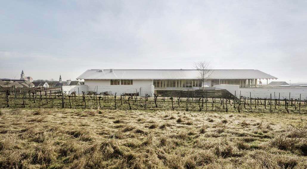 Die elegante Silhouette des modernen Gebäudes bereichert die sanfte Landschaft der Weinberge außerhalb der engen Dorfgassen entlang der Kellergasse Röschitz, einem UNESCO-Weltkulturerbe. Die langgestreckte, teilweise in den Hang gebaute Struktur, legt sich selbstbewusst und mit einer ruhigen Formensprache in den Kontext der Weinberge und verschmilzt dabei behutsam mit der Landschaft. Durch den Bau in die Tiefe von bis zu acht Metern in einen Hang aus Lehm und Lös wird eine nahtlose Verbindung zwischen der kleinteiligen Kellergasse und der großflächigen neuen Produktion hergestellt.