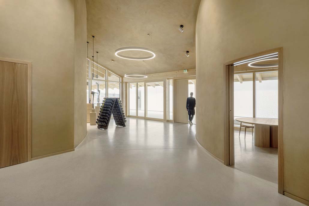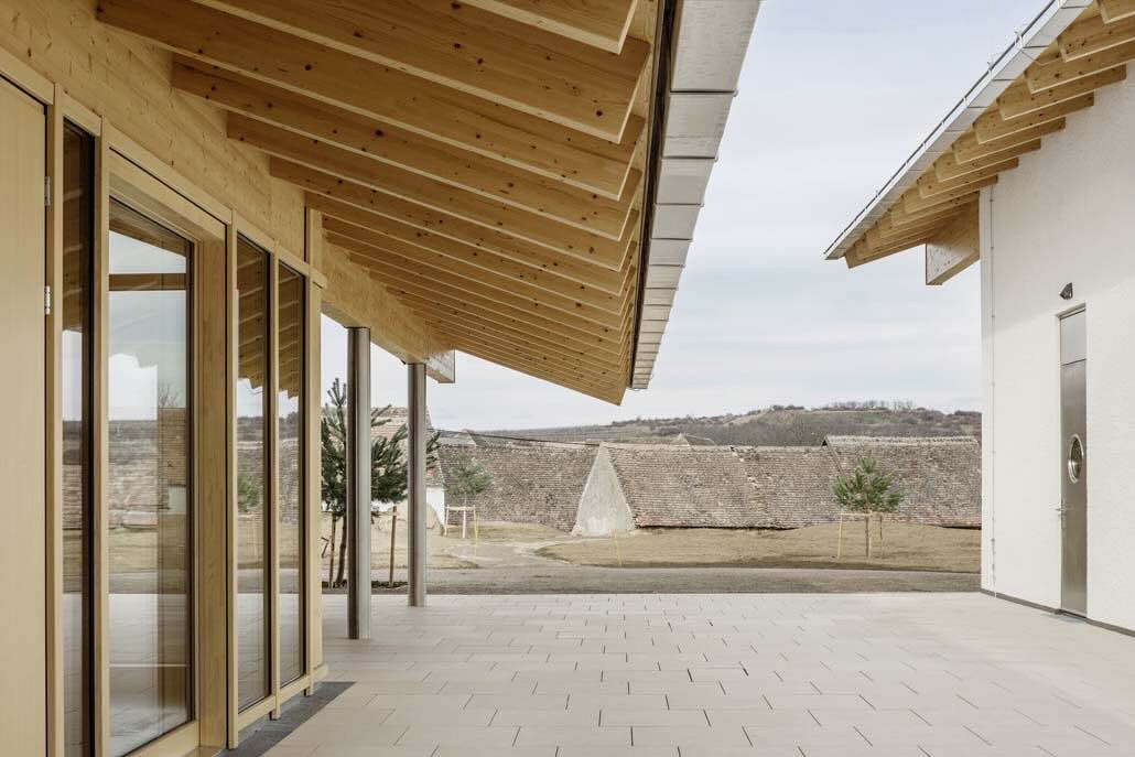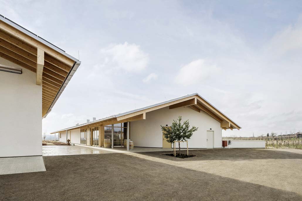 Architektonische Details wie das Satteldach und das Terrassengeländer aus aneinandergereihten Metall-Rundbögen schaffen eine harmonische Verbindung zwischen Weingut und Landschaft. Die zwei Meter breite Dach-Auskragung über dem umlaufenden Weg – der die unterschiedlichen Terrassen-Freibereiche erschließt, hält die Sonne ab und lenkt den Blick von innen gezielt auf die Landschaft. Die Verwendung von geworfenem Kalkputz würdigt traditionelle Kalkfassaden regionaler Presshäuser.