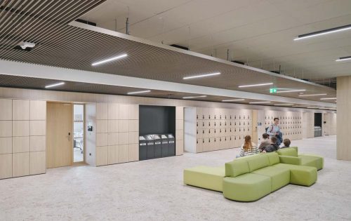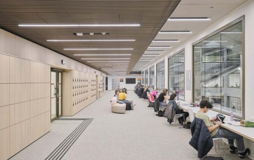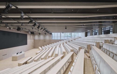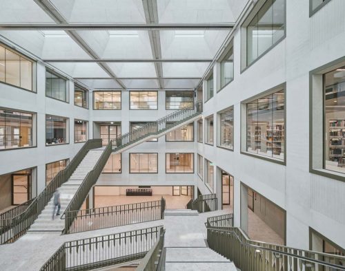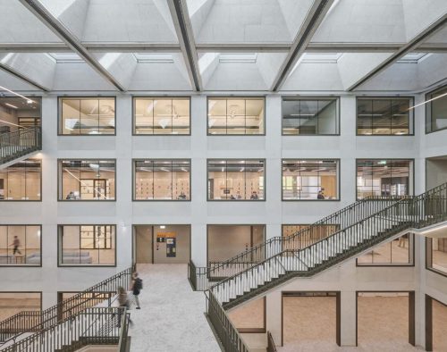 Die Struktur des Gebäudes entwickelt sich unmittelbar aus seiner Programmatik. Ein zentral platziertes Atrium bildet das Herz des Universitätsgebäudes, das Raum für Begegnung und Austausch schafft. Die Architektur fördert dabei die visuelle und physische Vernetzung der unterschiedlichen universitären Bereiche und bietet sowohl temporären als auch permanenten Arbeitsplätzen natürliches Licht und frische Luft.