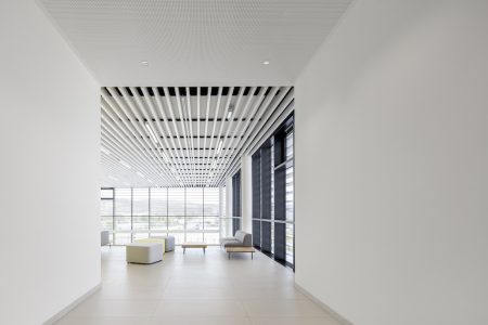 Zur Südseite und der dort tangierenden Landstraße erhielt das Gebäude eine Pfosten-Riegel-Fassade, die sich eingeschossig bis zur Cafeteria zieht und einen fließenden Übergang zur Terrasse im Außenbereich bildet. Einen Kontrapunkt dazu bildet die helle und monolithische Eternit-Fassade, durch große anthrazitfarbene Fensterbänder durchschnitten. Die unterschiedliche Farbgebung von Weiß und Hellgrau unterstützt ihrerseits die Unterscheidung zwischen den Funktionsbereichen der einzelnen Baukörper