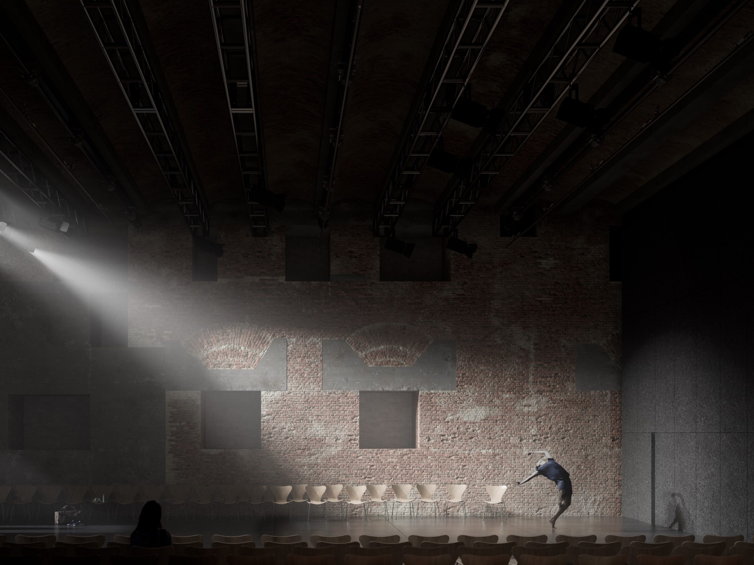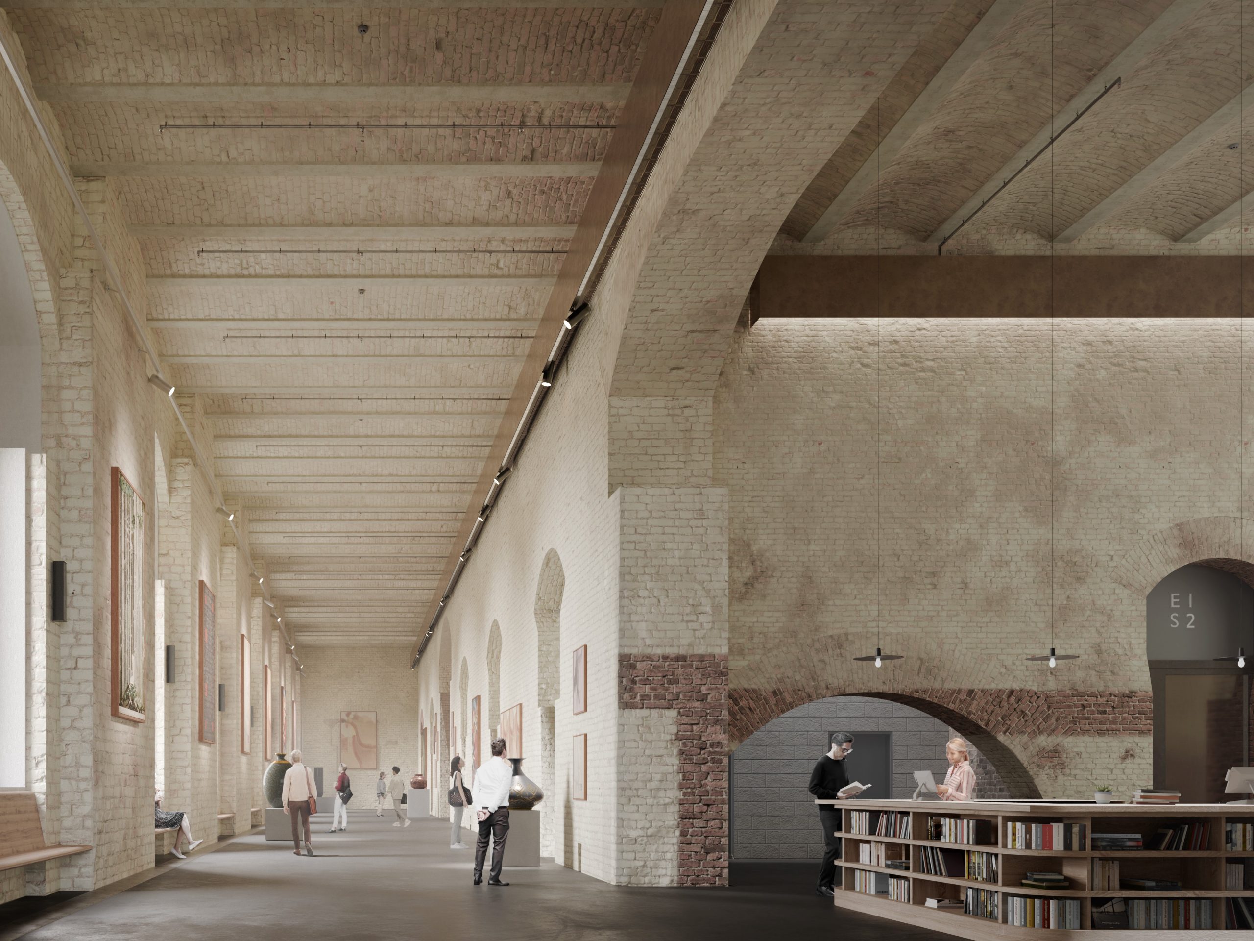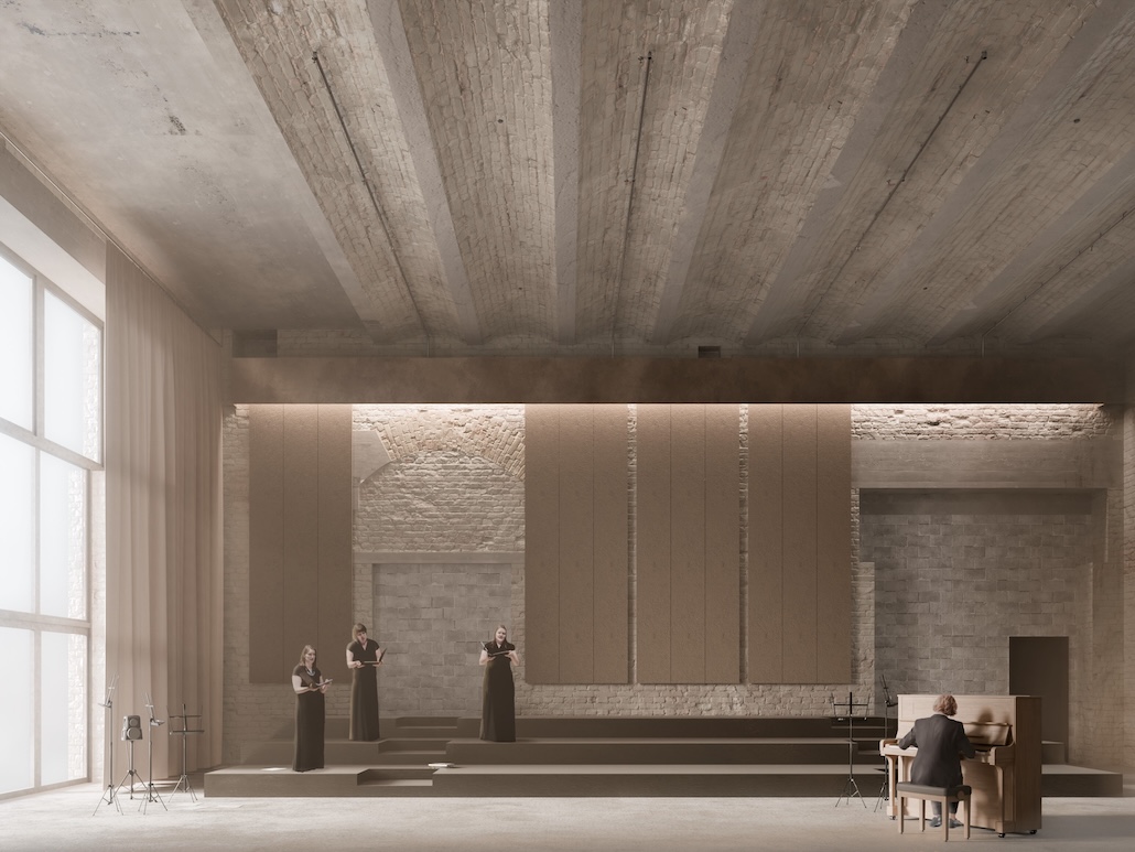 Der Entwurf für den Bestand übernimmt dezent Elemente – beispielsweise Beleuchtungskörper, runde Messingelemente beziehungsweise Reflektoren – aus dem Neubau und verbindet so auf subtile Weise Alt und Neu ohne jede Anbiederung und ohne den Gebäudeteilen ihre spezifische Eigenständigkeit zu nehmen. Es gelingt, den Bestand in seiner rohen, historischen Anmutung zu erhalten. Neu hinzu kommen sicher begehbare, barrierefreie Böden. Wände und Decken werden gereinigt, aber nicht verputzt oder neu gestrichen. Installationen erfolgen sichtbar, aber geordnet. Raumakustisch erforderliche Elemente sind gestalterisch zurückhaltend integriert und auf das Nötige beschränkt.