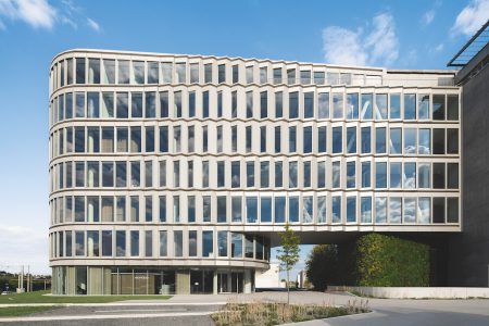 Der transparente Erdgeschoss-Sockel besteht aus verschiedenen Schüco Fassadensystemen. In den Rundungen sowie vor den Räumen im Osten kam die Pfosten-Riegel-Fassade FWS 50 mit höchsten Wärmedämmeigenschaften zum Einsatz, auf den ebenen Flächen neben dem Haupteingang die Panorama Design Fassade FWS 35 PD. Sämtliche elektrisch betriebenen Komponenten in der Fassade sind zentral gesteuert, gleichzeitig können sie von den Mitarbeitenden immer auch manuell bedient werden.