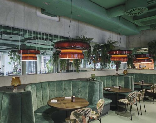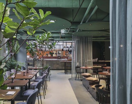 Abwechslungsreich gestaltete Sitzgruppen laden im Restaurant wie in der Lobby zum ausgiebigen Verweilen ein. Das Restaurant erstreckt sich auf 438qm und bietet auf seinen 197 Sitzplätzen lokale Küche bei freiem Blick ins Grüne. Das Hotel Indigo ist ein Projekt von BFA x KLK und BWM Architekten.