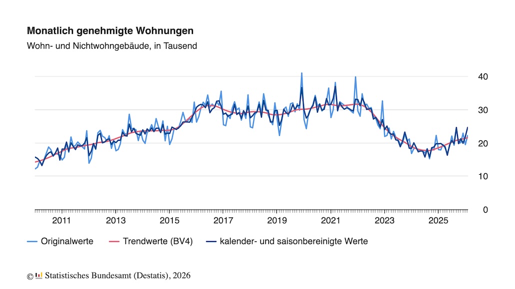 Im Zeitraum von Januar bis Februar 2026 wurde in Deutschland der Bau von 41 700 Wohnungen in neuen sowie bereits bestehenden Gebäuden genehmigt. Das waren 16,2 % oder 5 800 Wohnungen mehr als von Januar bis Februar 2025.