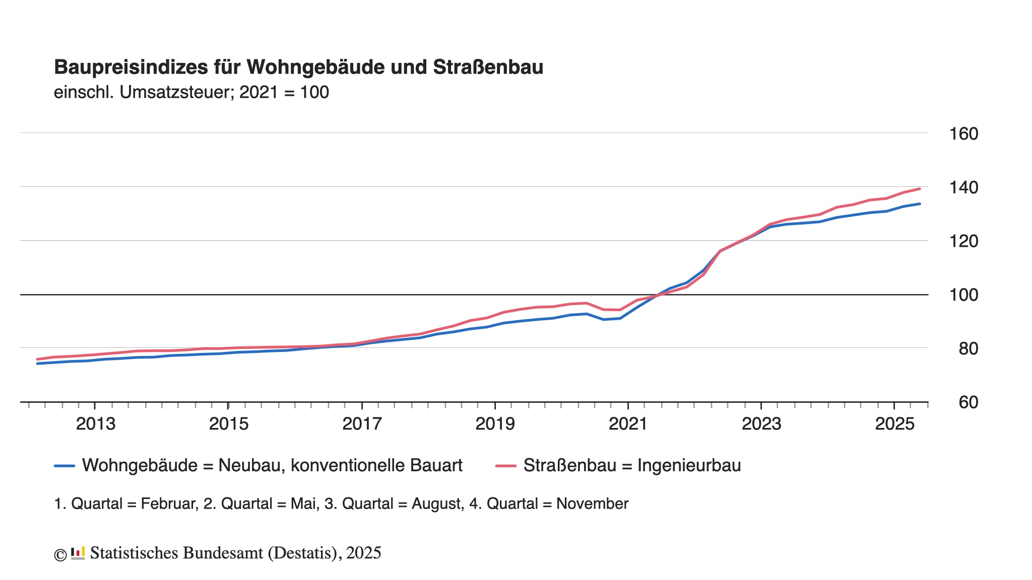 Die Neubaupreise für Bürogebäude stiegen zwischen Mai 2024 und Mai 2025 um 3,5 %, für gewerbliche Betriebsgebäude stiegen sie um 3,4 %. Im Straßenbau erhöhten sich die Preise um 4,4 % gegenüber Mai 2024.