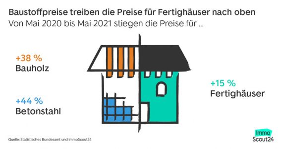 Berlin (pm) – Die Preise für Baustoffe waren im Mai 2021 teils deutlich teurer als im Vorjahr. Laut Statistischem Bundesamt war Konstruktionsvollholz im Mai 2021 um 83 Prozent teurer als im Vorjahresmonat. Die Preise für Dachlatten stiegen im selben Zeitraum um 46 Prozent und Bauholz um 38 Prozent. Auch der Stahlpreis ist deutlich angestiegen: Betonstahl, der zum Beispiel zur Verstärkung von Bodenplatten verwendet wird, war 44 Prozent teurer als im Vorjahr. Besonders von den steigenden Holzpreisen betroffen ist das Fertighaussegment, die Auswirkungen zeigen sich inzwischen auch bei den Neubau-Preisen. Allein in den drei Monaten von Ende März bis Ende Mai 2021 stiegen die Angebotspreise von Fertighäusern in Deutschland um 14 Prozent.