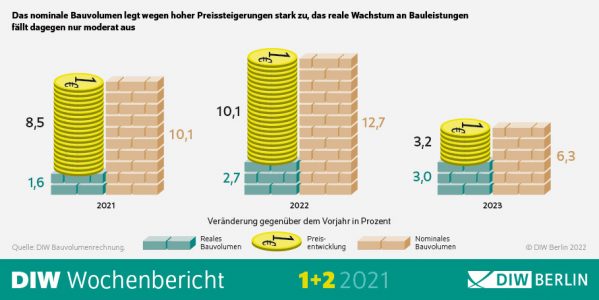 Berlin (pm) – Die deutsche Bauwirtschaft erweist sich gegenüber den wirtschaftlichen Ausschlägen der Corona-Pandemie als weitgehend resistent und bleibt auf Wachstumskurs. Die Nachfrage insbesondere nach Wohnraum bleibt ungebrochen, obwohl die Preise für Bauleistungen nach oben schießen. Der Preisanstieg trug maßgeblich dazu bei, dass das nominale Bauvolumen nach Berechnungen des Deutschen Instituts für Wirtschaftsforschung (DIW Berlin) im abgelaufenen Jahr um rund zehn Prozent auf einen historischen Höchstwert von 488 Milliarden Euro kletterte, was einem Anteil von knapp 15 Prozent des Bruttoinlandsprodukts (BIP) entspricht. In diesem Jahr wird die Bauleistung voraussichtlich um weitere fast 13 Prozent und im kommenden Jahr um gut sechs Prozent zulegen. Preisbereinigt bleibt für 2022 und 2023 immer noch ein Zuwachs von jeweils rund drei Prozent. „Die Bauindustrie ist und bleibt ein Stützpfeiler der coronageplagten deutschen Wirtschaft“, sagt Martin Gornig, Studienautor und Forschungsdirektor Industriepolitik am DIW Berlin. „Die besonderen Kapazitätsengpässe und der hohe Nachfragedruck machen die Bauwirtschaft aber auch zu einem Treiber der Inflation.“