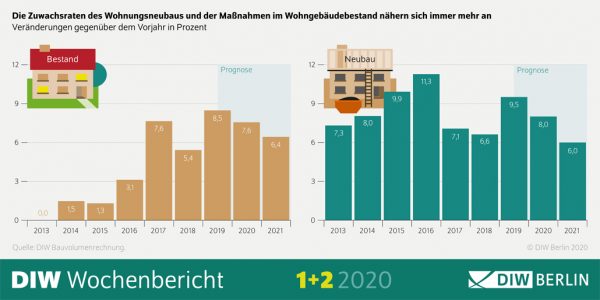 „Die wichtigste Stütze für die Bauwirtschaft ist der weiterhin florierende Wohnungsbau“, so Studienautorin Laura Pagenhardt. „Sowohl der Neubau als auch die Sanierung und Modernisierung des Gebäudebestands profitieren von den günstigen Rahmenbedingungen wie den niedrigen Zinsen, dem robusten Arbeitsmarkt, aber auch politischen Maßnahmen wie dem Baukindergeld und den Abschreibungsmöglichkeiten.“ Das Wohnungsbauvolumen wird nach einem Plus von 8,8 Prozent im Jahr 2019 um rund acht Prozent in diesem Jahr und gut sechs Prozent im Jahr 2021 steigen, prognostizieren die Studienautoren. Der Wohnungsneubau entwickelt sich den Berechnungen zufolge deutlich besser als die Bauleistungen an bestehenden Gebäuden.