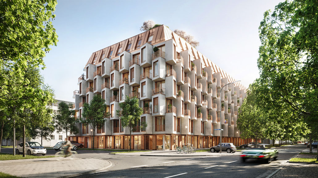 Ben van Berkel: Zu Beginn des Entwurfsprozesses haben wir uns die Gebäude in der Umgebung angesehen – insbesondere im Hinblick auf die verwendeten Materialien, die verschiedenen städtebaulichen Typologien und die Merkmale des Geländes als Ganzes –, um diese vorhandenen Qualitäten in Van B aufzunehmen. Als Teil dieser Analyse untersuchten wir auch die künftig geplanten Entwicklungen rund um das Grundstück und welche Art von Nutzern diese anziehen würden. Die schöne Infanteriestraße in Kombination mit dem Geist des zukünftigen Kreativquartiers gleich nebenan haben uns zu der Idee geführt, das Innen-Außen-Wohnkonzept auf diesen Standort zu übertragen. Das Projekt ist so konzipiert, dass es mit dem Stadtgefüge der Umgebung zusammenwirkt, ohne aber seine eigenständige Identität aufzugeben.