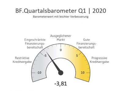 Stuttgart (pm) – Die Stimmung unter den deutschen Immobilienfinanzierern verbessert sich im ersten Quartal 2020 leicht, bleibt aber insgesamt deutlich im negativen Bereich. Der Barometerwert steigt von -4,41 Punkten im vierten Quartal 2019 auf -3,81 im ersten Quartal 2020 (+0,6 Punkte).
