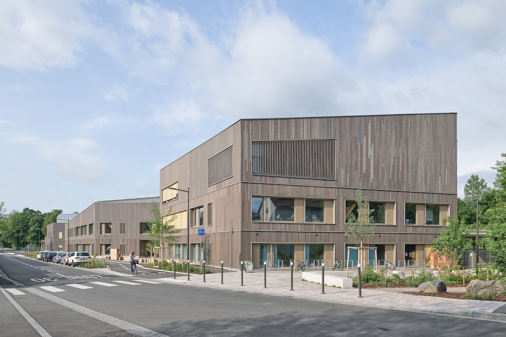 Straßburg (abki) – Mit dem Bildungsensemble Jean Mentelin ist in Straßburg eine neue Schulanlage für Kindergarten, Volksschule, Kantine und Hort entstanden. Das in Holzbauweise realisierte Projekt wurde von feld72 Architekten mit MW Architectes umgesetzt und reagiert auf einen Bauplatz mit gegensätzlichen räumlichen Bedingungen: Im Osten grenzt das Areal an eine semiindustrielle Peripherie, im Westen öffnet es sich zu einem Naturschutzgebiet.