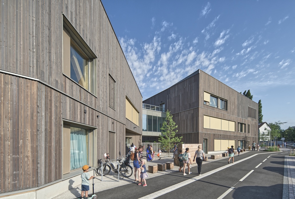 Drei kompakte, großflächig facettierte Baukörper vermitteln zwischen Straßenraum und Auenlandschaft. Trotz des umfangreichen Raumprogramms bleibt das Ensemble auf einen kindgerechten Maßstab ausgerichtet. Kinderfreundliche Proportionen, individuelle Adressbildung und eine jeweils eigene Identität für die unterschiedlichen Schulformen strukturieren die Anlage.
