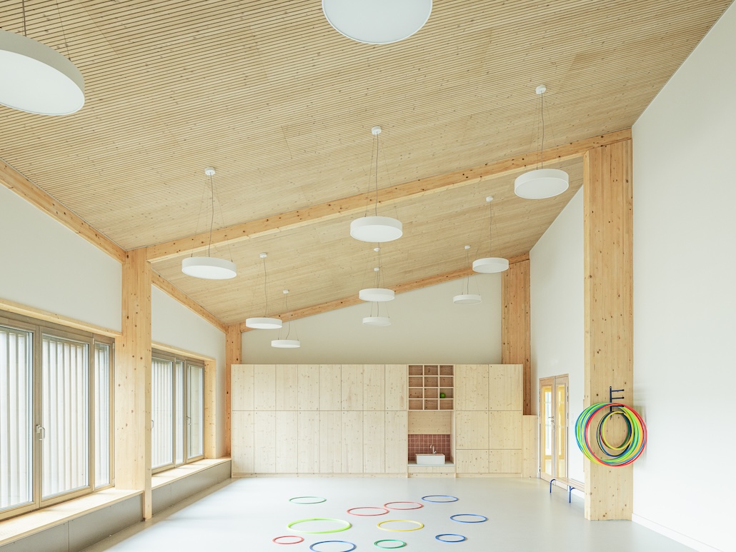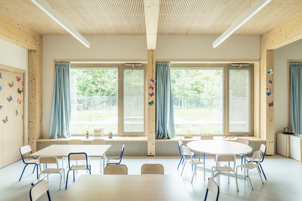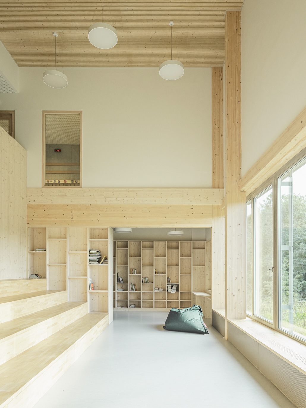 Die architektonische Setzung versteht sich als Ort des Lernens und Wachsens im respektvollen Dialog mit der Natur. Diese Haltung zeigt sich auch in der Materialwahl: Das Ensemble ist als ökologisch nachhaltige Holzkonstruktion ausgebildet. Holz prägt Tragstruktur, Fassade und Innenausbau gleichermaßen. Die Lamellen der vorgegrauten und lasierten Lärchenholzverkleidung fungieren als durchgängiges Gestaltungselement und zugleich als visueller Filter. Fensteröffnungen mit integrierten Sitznischen stärken den Bezug zwischen Innen- und Außenraum.
