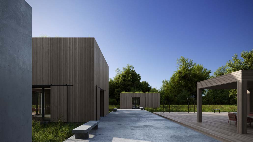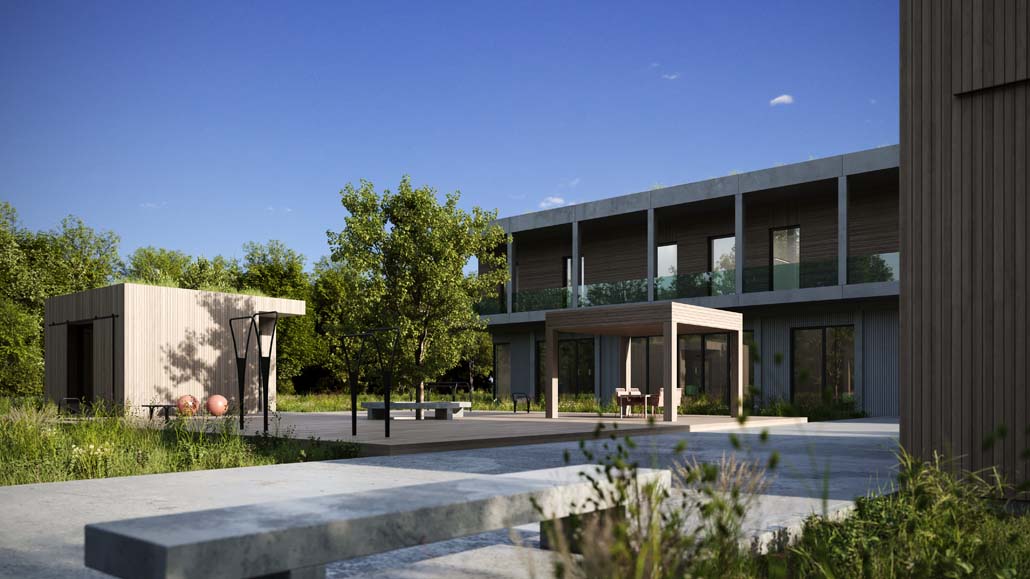 Kern des Konzepts ist der Bau eines neuen Verwaltungsgebäudes in Meppen in Niedersachsen, das durch drei Tiny Houses im angrenzenden Wald ergänzt wird. Die Tiny Houses schaffen Arbeits- und Begegnungsräume für Baufacharbeiter:innen sowie Büromitarbeiter:innen und fördern so den Austausch und das Verständnis untereinander. Der Austausch zwischen den Mitarbeiten findet vornehmlich in Tiny House 2, das als Meetingraum dient, sowie in Tiny House 3 während Pausen und Auszeiten statt. Im Freizeit- und Begegnungsraum sind in Tiny House 3 auch Sportaktivitäten wie z. B. Tischtennis möglich. Tiny House 1 dient dagegen als Fokusraum. Die drei Tiny Houses des Bauunternehmens Oehm bieten somit Arbeits- und Rückzugsorte mit besonderer Qualität mitten in der Natur.