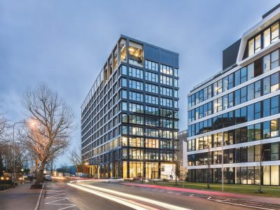 Die Fassade wurde als individuell angepasste Sonderkonstruktion des hochwärmedämmenden Aluminiumfenstersystems Schüco AWS 75 BS.HI+ in Kombination mit dem bauwerkintegrierten Photovoltaiksystem von Schüco ausgeführt. Das Cradle-to-Cradle-zertifizierte System wurde bewusst allseitig umgesetzt, um einen einheitlichen Gesamteindruck zu erreichen und um trotz der geringeren Effizienz auf der weniger belichteten Nordseite einen maximierten Gesamtertrag zu erzielen. Die integrierten PV-Module liefern eine Leistung von rund 180.000 kWh/Jahr und decken damit übers Jahr gesehen und im Verbund mit der PV-Anlage auf dem Dach über die Hälfte des Gesamtenergiebedarfs in Bezug auf den Allgemeinstrom. Über die Wechselrichter wird der von den PV-Elementen erzeugte Gleichstrom direkt in das Hausnetz eingespeist. Die Wärme- und Kälteerzeugung erfolgt dabei rein elektrisch über zwei Wärmepumpen und zwei Kältemaschinen. Überschüssige Leistung bei sommerlichen Spitzen wird ins öffentliche Netz abgegeben. „Die umgesetzte Fassadenlösung sorgt für eine deutliche Senkung der Betriebskosten. Außerdem ermöglicht sie eine deutlich leichtere Vermietung und eine höhere Rendite“, fasst Salar Ebadollahi den Mehrwert zusammen.