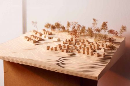 Eine Schwierigkeit, für die alle Gruppen eine Lösung zu finden hatten, war die starke Hanglage des Geländes. Die Gruppe um Pablo Thiemig entschied deshalb, ihre Mehrfamilienhäuser treppenartig in den Hang zu schieben und die Dachflächen als begrünte und begehbare Terrassen zu nutzen: „Für unseren Entwurf war der Gedanke eines Mehrgenerationenwohnens leitend. Das wollten wir mit den verschiedenen Formen betreuten Wohnens auf dem Gelände zusammenbringen. Die Dachflächen sollen als Ort der Begegnung zugänglich sein, auf dem sich die tolle Landschaft erleben lässt.“ Für ein Foto steht Thiemig mittlerweile vor dem Hörsaalgebäude und hält lächelnd das Modell seines Teams in den Händen, auf dem sich drei seiner zweigeschossigen Kuben wie überdimensionale Treppenstufen in den Hügel einfügen.