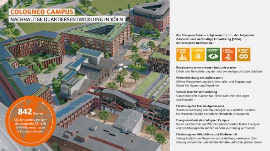 Das Projekt Cologneo Campus in Köln-Mülheim etwa ist ein hervorragendes Beispiel dafür den effizienten und praxisnahen Einsatz eines passgenauen Energiedesigns: Hier entsteht auf dem ehemaligen Areal des Weltkonzerns Klöckner-Humboldt-Deutz ein attraktives, zukunftsweisendes Quartier für Arbeiten, Wohnen, Gewerbe und Kreativwirtschaft. Allein im Bürohaus Nord wurden bereits 2021 siebzehn Erdsonden à 100 Metern zur zukünftigen Versorgung mit regenerativen Energien eingesetzt. Im nächsten Schritt erfolgt hier die Installation der Photovoltaikanlage mit Gründach und 382 Solarpaneelen. Insgesamt wird das Quartier nach Fertigstellung voraussichtlich 86 Prozent an CO2-Emissionen durch den Einsatz von regenerativen Energien einsparen. Durch einen zusätzlichen Einkauf von „grün-zertifizierten“ Strom können die jährlichen CO2 – Emissionen um 100% reduziert werden.