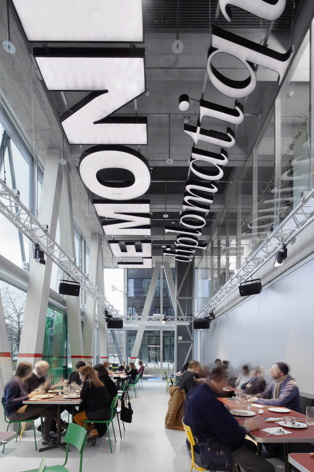 Der Neubau der taz vermittelt in seiner besonderen Ecklage an der Friedrichstrasse zwischen dem traditionellen Berliner Block und den Solitärbauten aus der Zeit der IBA von 1984. Aus der Kombination von Ecke und Block wurde eine einfache Lösung vorgeschlagen: Entlang der Friedrichstrasse werden die Berliner Traufhöhen übernommen und der Block weitergeführt. Ein Rücksprung in der Fassade entlang der Friedrichstrasse bildet ein klar akzentuierter Eingang. Das strukturelle System des neuen Hauses ist als Netz ausgebildet. Mit möglichst wenigen Elementen wird eine grösstmögliche Belastbarkeit erreicht. Es ist eine Struktur, in der alle Teile gleichviel leisten müssen und nur zusammen Stabilität erreichen. Es ist ein System ohne Hierarchie. Die architektonische Anmutung des neuen Hauses für die taz wird so Struktur und Sinnbild der Organisation zugleich. Die Hauptstruktur besteht aus diagonalen Verstrebungen entlang der Gebäudehülle und erfordert keine zusätzliche Unterstützung auf der Innenseite. Die dreizehn Meter tiefen Büroflächen schaffen eine Werkstattatmosphäre und ermöglichen eine Vielzahl unterschiedlicher Arbeitsformen. Die Treppenskulptur im Zentrum des Neubaus bildet aufgrund ihrer Dimension und Plastizität eine vertikale Fussgängerzone über die ganze Höhe des neuen Hauses. Sie ist ein Ort der Begegnung und des informellen Austauschs. Hier atmet das Gebäude und fördert die spontane Kommunikation.