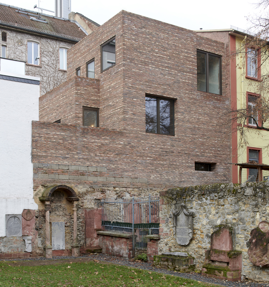 In Frankfurts Innenstadt sollte ein Wohn- und Geschäftshaus in einen Hinterhof erweitert werden. Das Besondere an dieser Bauaufgabe war– entgegen üblicher Hinterhofsituationen – die Sichtbarkeit der neuen Bebauung vom angrenzenden Peterskirchhof aus. Diese parkähnliche Anlage mit seiner umgrenzenden Friedhofsmauer ist denkmalgeschützt. Im Konzeptgedanken steht nicht eine Abgrenzung, sondern das Weiterbauen und die Akzentuierung der Zeitschichten im Vordergrund. Der Neubau wurde daher mit einer Klinkerfassade auf die Friedhofsmauer aufgebaut. Das Sichtmauerwerk ist mit verschiedenen Steinformaten horizontal geschichtet, sodass sich das (Zeit-)Schichten auch in der Materialität manifestiert. Die Bebaubarkeit war auf Grund der Abstandsregelungen begrenzt. Die Kubatur ist im Hinblick auf die Baumasse und die Belichtungssituationen präzise abgestimmt. Im Erdgeschoss wurde eine bereits vorhandene Gewerbeeinheit erweitert. In den Obergeschossen entstanden zwei Wohneinheiten. Sie sind ein Beitrag zur Verdichtung der Frankfurter Innenstadt mit der Schaffung von Wohnraum.