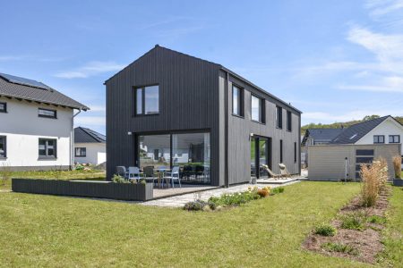 Wolfhagen (pm) – Im Neubaugebiet der nordhessischen Kleinstadt Wolfhagen liegt das in Holzrahmenbauweise errichtete schwarze Haus. Betont durch die dunkle Fassade, und dennoch eingebettet in eine dunkle Dachlandschaft liegt es in einer Nachbarschaft aus weißen Häusern mit dunkelgrauen Dächern und Fenstern. Es hebt sich hervor, und kann sich dennoch zurück nehmen. Auf dem schmalen Grundstück erstreckt sich das längliche Einfamilienhaus über 16m bei ca. 6m Breite. Das in Holzrahmenbauweise (Holzrahmen + Holzweichfaserplatte) geplante und vorgefertigte Haus ist mit den Wohnräumen gen Süd-Westen ausgerichtet, sodass der Fortlauf der Sonne ganztägig für einen unterschiedlichen Sonneneinfall sorgt. Das Haus verfügt über zwei Vollgeschosse. Ohne Dachüberstand und durch klare aber reduzierte Details entsteht ein skulpturaler Charakter, welcher durch die dunkle Fassade unterstrichen wird. Die Fassade des Hauses ist in sägerauer, heimischer Lärche in 3 unterschiedlichen Brettbreiten ausgeführt. Die gesamte Fassade ist mit einer dunkelgrauen Farbbeschichtung versehen worden, welche die natürliche Maserung und raue Struktur der Lärchenbretter sichtbar lässt. Bei der Fassadengestaltung wurde bewusst darauf geachtet, durchgehende Brettlängen, ohne horizontale Stöße, zu erhalten. Alle Detailpunkte, wie Fensterbänke, Blendrahmen und Schornstein sind in mattem schwarz gehalten, ebenfalls wurde die Dachentwässerung in mattem Schwarzzink gestaltet. Als Dacheindeckung wurde eine ebenfalls schwarze Beton-Flachziegel verwendet. Durch den zwar länglichen, aber dennoch kompakten, schmalen Baukörper und die zentrierte Anordnung der Sanitärbereiche konnten Baukosten kontrolliert und reduziert werden. Ebenfalls wurden Fensterformate, welche exakt auf die Fassadengliederung abgestimmt sind, vereinheitlicht, sodass keine vielen unterschiedlichen Formate existieren. Eine Unterkellerung wurde nicht vorgesehen.