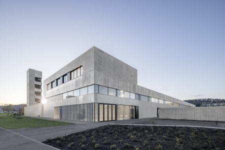 Das Zentrale Feuerwehrgerätehaus fügt sich in der Längsorientierung der Umge-bungsbebauung ein, setzt jedoch am Ende der Kleemattstraße und von der B316 aus ein Erkennungszeichen am Stadteingang. Der kompakte größtenteils zweigeschossi¬ge Baukörper umschließt die Fahrzeughalle u-förmig. Der 23 Meter hohe Übungsturm befindet sich abgerückt, westlich in der Flucht des Hauptkörpers und ist bereits aus der Ferne wahrnehmbar.