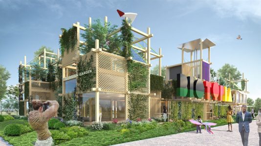 Der Pavillon des Deutschen Gartens – der eine stetig wachsende und sich wandelnde Stadt symbolisiert – besteht aus einer bis zu zweistöckigen, kubistisch anmutenden Holzkonstruktion, die vielerorts durchgängig ist. Für eine nachhaltiger Energiegewinnung wurden modernste Solarpaneelen und Windkraftturbinen verbaut. Das Gebäude umspannt das gesamte Areal und öffnet sich nach innen hin zu einem großen Atrium. Dank intensiver Bepflanzungen bildet der Pavillon selbst ein lebendiges Ökosystem, das dazu beiträgt, die Umgebungstemperatur zu senken und dessen Erscheinungsbild sich im Verlauf der Expo stetig verändern wird. Allein 22 verschiedene Arten Kletterpflanzen kommen hier als Fassadenbegrünung zum Einsatz; und 43 Stauden- und Gräserarten sowie 18 Gehölzarten finden auf dem begehbaren Dach ihren Platz. In luftiger Höhe wird zudem gezeigt, wie sich urbane Dachflächen auch für den Anbau von Gemüse und Obst nutzen lassen.