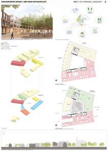 Die Nutzungen – wie Bibliothek, Gastronomie, Musikschul- und VHS-Räume – sind in den Erdgeschossen am Platz für die Bürger:innen gut erreichbar und leicht auffindbar, der „Welcome Desk“ des Rathauses hat am zentralen Platz eine sehr gute Adressbildung und stärkt die Funktion des Platzes auch als Dienstleistungsort der Verwaltung. Das Gebäude der heutigen Gottfried-Benn-Bibliothek soll saniert und für Büros genutzt werden.“
