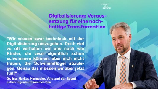 „Wir wissen zwar technisch mit der Digitalisierung umzugehen“, sagt Dr.-Ing. Markus Hennecke, Vorstandsmitglied der Bayerischen Ingenieurekammer-Bau“. „Doch viel zu oft verhalten wir uns noch wie Kinder, die zwar eigentlich schon schwimmen können, aber sich nicht trauen, die Schwimmflügel abzulegen“, kritisiert er. „Damit Bayern bis 2040 klimaneutral werden kann, müssen wir unsere Bauprozesse verändern“ erläutert Hennecke. „Der Bauwirtschaft ist es ernst damit. Auf Initiative der Bayerischen Ingenieurekammer-Bau haben sich die wichtigsten Akteure der Branche zum Bündnis ‚Sustainable Bavaria‘ zusammengeschlossen. Gemeinsam haben wir sechs zentrale Stellschrauben identifiziert, die alternativlos sind, um die Transformation der Bauwirtschaft zu schaffen. Unsere Forderungen liegen auf dem Tisch – der Ball liegt nun im Bayerischen Landtag, wo die notwendigen Voraussetzungen geschaffen werden müssen.