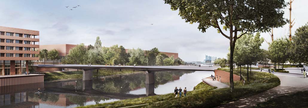 Hamburg (pm) – Der nördliche Teil des neuen Stadtentwicklungsgebietes Grasbrook, das sogenannte Moldauhafenquartier, bildet eine Halbinsel in der Norderelbe und ist hauptsächlich von Wasser umgeben. Brücken als Verbindungswege spielen daher eine zentrale Rolle, sowohl für die innere als auch für die äußere Erschließung. Hierzu gehört auch die neue Moldauhafenbrücke, die das Moldauhafenquartier mit dem Hafentorquartier hochwassergeschützt miteinander verbindet und vorrangig auf den Fuß- und Radverkehr ausgelegt ist. Der von der HafenCity Hamburg GmbH im Einvernehmen mit der Behörde für Stadtentwicklung und Wohnen ausgelobte Gestaltungswettbewerb wurde jetzt entschieden. Als Preisträger gingen Schüßler-Plan Ingenieurgesellschaft mbH (Berlin) mit DKFS Architects (London) hervor. Baubeginn für die Moldauhafenbrücke ist 2026.