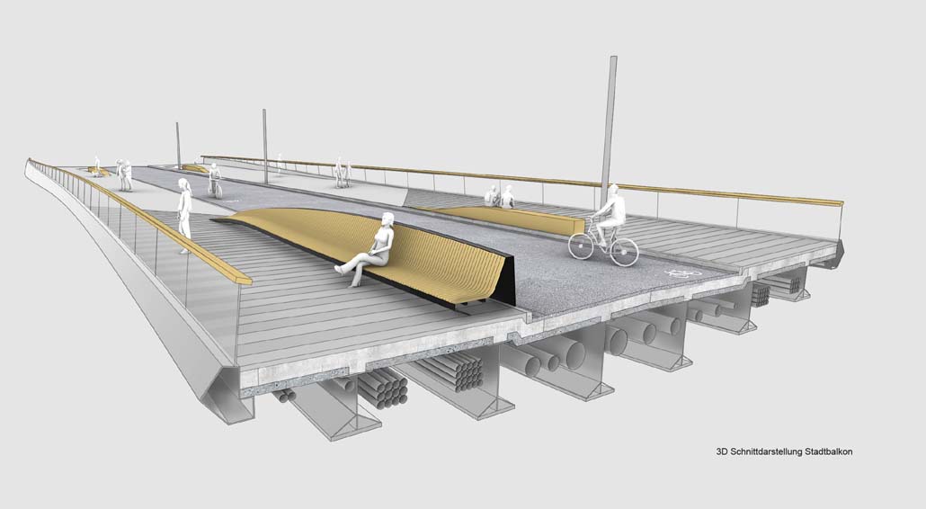 Dipl.-Ing. Frank Ehrlicher, Abteilungsleitung Ingenieurbau Straße, Schüßler-Plan Ingenieurgesellschaft mbH: „Das Tragwerk folgt konsequent dem Entwurfskonzept zur Ausformung eines funktionalen, wirtschaftlichen Brückentragwerks. Dies erfolgt durch Ausbildung eines symmetrischen Dreifeldträgers in Gestalt einer Deckbrücke. Mit der festen Verbindung zwischen dem Überbau und den Pfeilern entsteht im Mittelfeld ein klassisches Rahmentragwerk, dessen Beanspruchung durch die veränderliche Höhe der Stahlträger aufgenommen und leicht nachgezeichnet wird. Dieses Entwurfsprinzip wird durch die Abstufung der Trägerhöhen über den Brückenquerschnitt, die der abgestuften Belastung in Querrichtung entspricht, nochmals betont. Über das eigentliche Tragwerk und dessen gestalterischer Ausformung hinaus ermöglicht die effiziente Kombination der verwendeten Materialien Stahl und Beton die Ausbildung einer dauerhaften, material- und ressourcensparenden Brücke.“