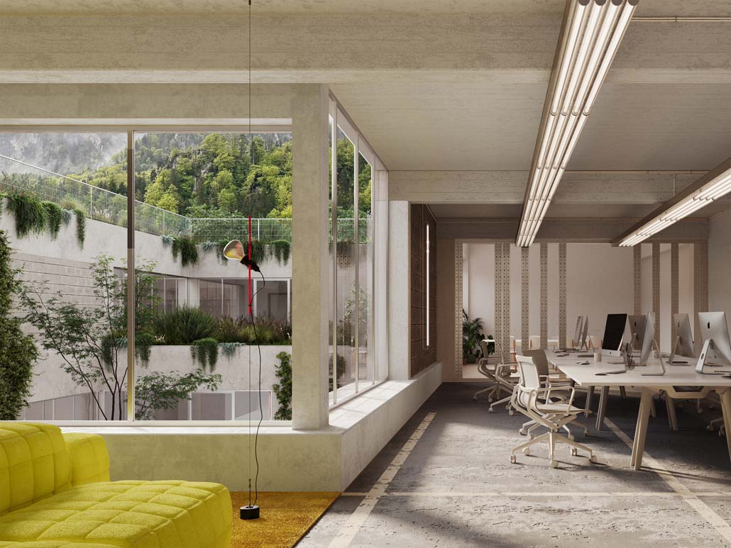 smartvoll Architekten ZT KG zeichnen für die Planung und architektonische Transformation des Areals verantwortlich. Das über Jahrzehnte gewachsene Ensemble mit rund 16.000 m² Nutzfläche wird nicht abgerissen, sondern in seiner Substanz weiterentwickelt. Bestehende Hallen, Trakte und Anbauten werden funktional überprüft und – wo sinnvoll – erhalten. Anpassungen erfolgen gezielt: Zwei neu eingeschnittene Lichthöfe bringen Tageslicht bis ins Zentrum des größten Bestandsbaus und eröffnen neue Sichtachsen auf Untersberg und Gemeinberg.