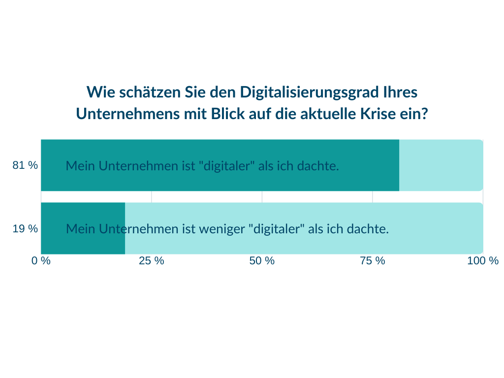 Die Auswirkungen der Corona-Pandemie auf den Arbeitsalltag haben bei fast der Hälfte der Befragten zu einem Umdenken geführt: Die Mehrheit dieser Auswahl (81 Prozent) schätzt den Digitalisierungsgrad ihres Unternehmens nun höher ein als vor der Pandemie. Insgesamt sind über 50 Prozent aller Umfrageteilnehmer der Meinung, in einem digital orientierten Unternehmen zu arbeiten. Elf Prozent geben an, dass ihr Unternehmen den digitalen Transformationsprozess bereits komplett vollzogen hat.