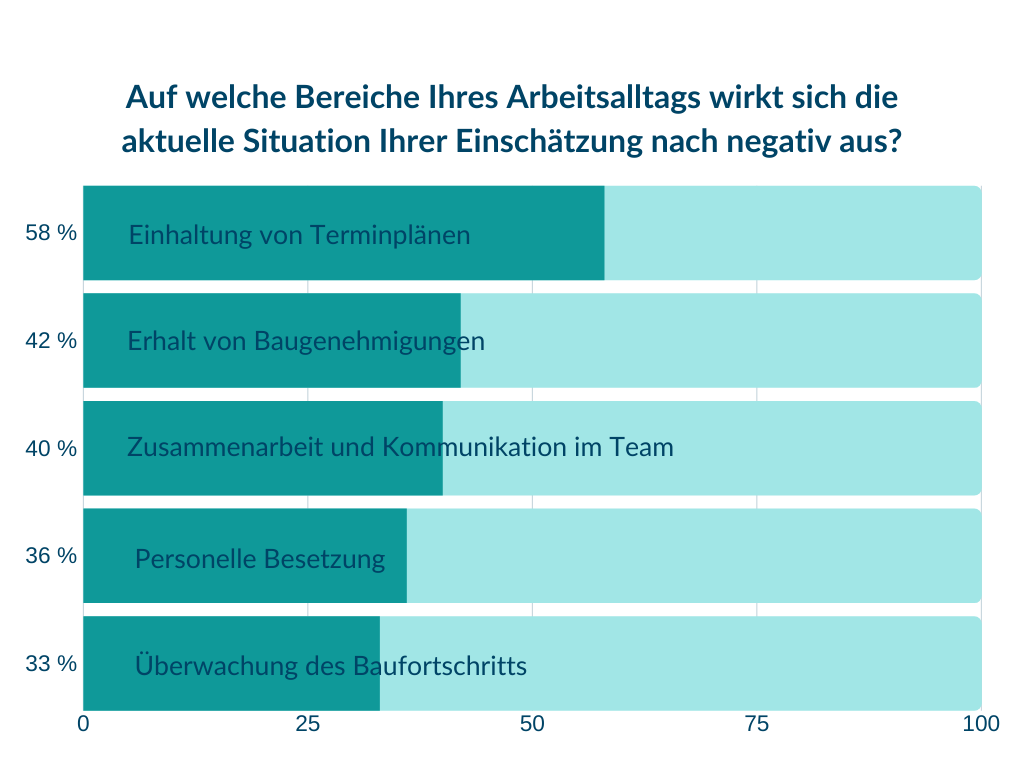 Durch die Verbreitung des Coronavirus wird die Einhaltung von Terminplänen (58 %) sowie der Erhalt von Baugenehmigungen (42 %) nach Einschätzung der Projektentwickler und Projektsteuerer beeinträchtigt. Zusätzlich haben viele Unternehmen ins Homeoffice gewechselt. Die daraus resultierende räumliche Trennung erschwert die Zusammenarbeit und Kommunikation im Team (40 %). Weitere Schwierigkeiten sehen die Befragten bei der personellen Besetzung und der Überwachung des Baufortschritts.