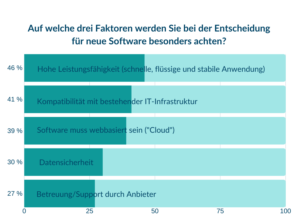 Bei der Anschaffung neuer Software-Lösungen ist für knapp die Hälfte der Befragten die hohe Leistungsfähigkeit (46 %) das ausschlaggebende Kriterium. Zusätzlich muss die neue Software mit der bestehenden IT-Infrastruktur kompatibel sein (41 %). Knapp 40 Prozent würden bei der Auswahl besonders darauf achten, dass die Software webbasiert ist (“Cloud”).