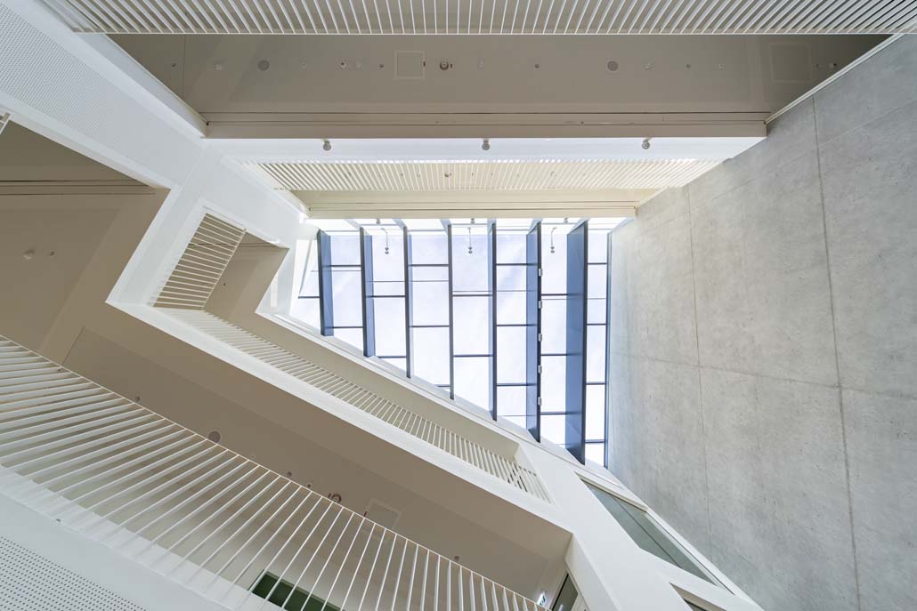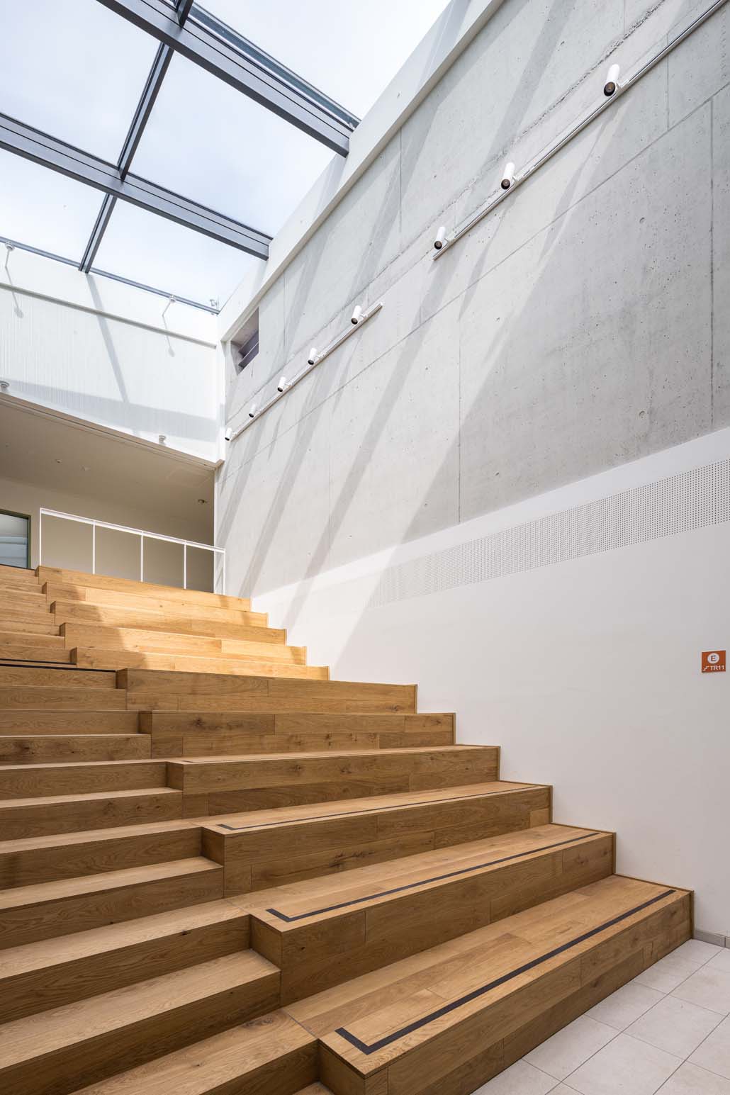 Die beiden neuen Gebäude für die Sekundarstufen I und II orientieren sich an zeitgemäßen pädagogischen Anforderungen. Großzügige Foyers, lichtdurchflutete Lufträume, offene Treppenhäuser, flexible Lerninseln sowie bewusst gesetzte Rückzugsorte prägen die Architektur. Dabei verbinden natürliche Materialien, eine klare Formsprache und wohnliche Farben Funktionalität mit Atmosphäre.