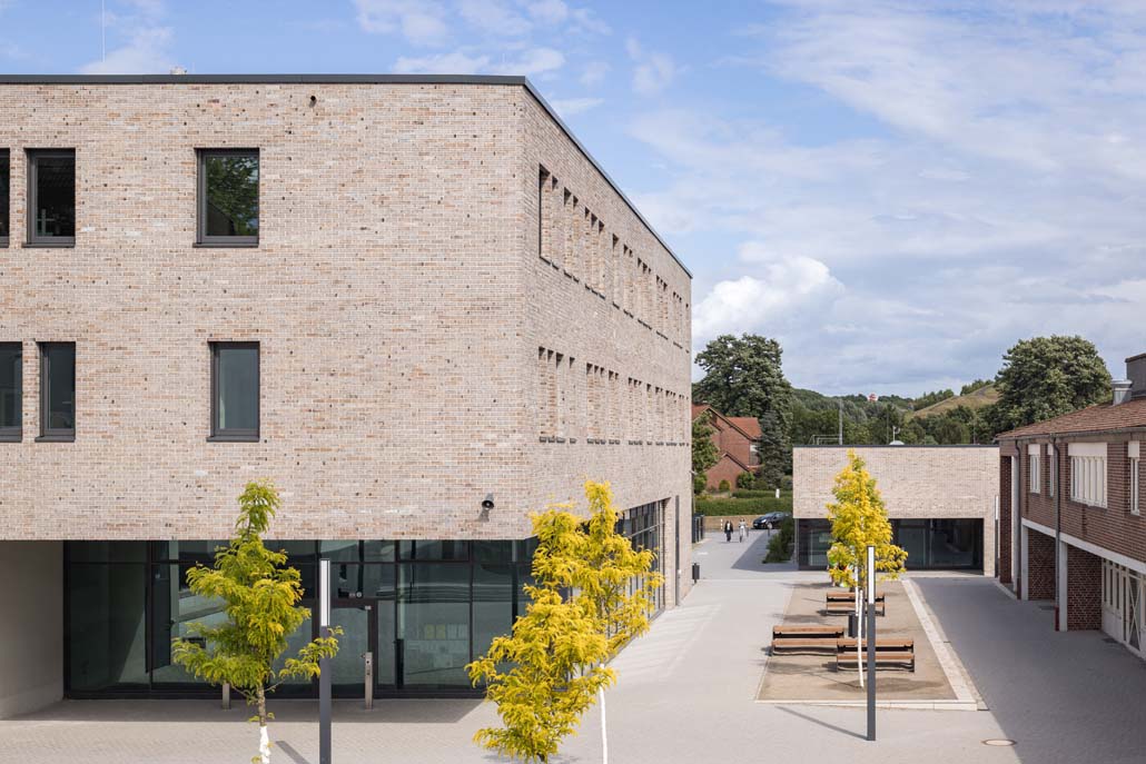 Der denkmalgeschützte Altbau von 1912 bleibt als identitätsstiftendes Element erhalten. Durch die neuen Baukörper erhält er eine architektonische Bühne und wird funktional eingebunden. Eine einheitliche Materialwahl mit Klinkerfassaden in warmen Rottönen verbindet Alt und Neu und verankert das Ensemble im Quartier.