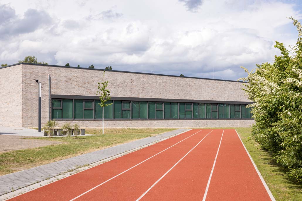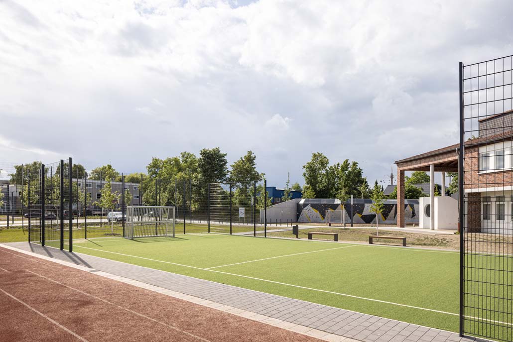 Neben der Gebäudearchitektur wurde auch der Außenraum konsequent in das pädagogische Konzept eingebunden. Der Hauptplatz wird ergänzt durch eine teilversenkte Zweifachsporthalle, einen Schulgarten sowie einen weitläufigen Sportpark mit Laufbahn, Soccerplatz, Kugelstoßanlage und Kletterwand. Diese Elemente fördern Bewegung im Alltag und schaffen vielfältige Begegnungsräume.