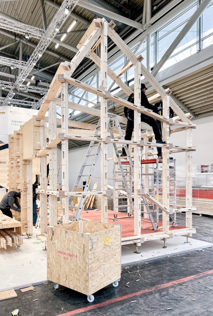 Der erste Prototyp – ein rund 20 m² großes Gebäude – wurde bereits realisiert und auf der BAU 2025 in München vorgestellt. Besonders geeignet ist das innovative Bausystem für urbane Nachverdichtungsprojekte – etwa Aufstockungen und Erweiterungen von Bestandsgebäuden. Für Krüger und sein Forschungsteam steht nun eine angewandte Testphase im Fokus: „Der nächste Schritt ist der Bau eines weiterentwickelten Prototyps, der in der Stadt getestet werden soll.“
