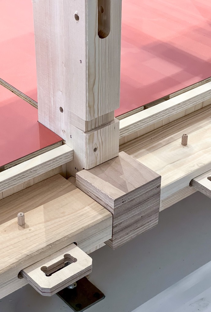 Sobald der Entwurf abgeschlossen ist, erzeugt das System automatisch die Produktionsdaten für jedes einzelne Bauteil des Holzhauses. Eine computergesteuerte Anlage für Holzbearbeitung produziert die Bauelemente, die sich dann unkompliziert zusammenstecken lassen. „Besonders wichtig ist uns der Aspekt der Nachhaltigkeit und so setzen wir auf Holz als nachwachsenden Baustoff, wodurch der ökologische Fußabdruck des Bauens deutlich reduziert werden kann“, betont Krüger. Ein weiterer Vorteil des neuen Holzbausystems ist ein gesteckter Knotenpunkt, der verbunden und auch wieder gelöst werden kann. So wird ein sortenreiner Rückbau gewährleistet, also die Möglichkeit das Baumaterial wieder getrennt zu recyceln.