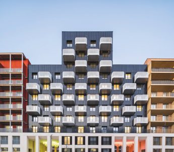 Das Atelier Pascal Gontier ließ für drei Bauwerke im Block A2 verschiedene Sonderformen der MOEDING Fassadenplatten ALPHATON® fertigen. Am nordseitigen Gebäude A2 prägen oxidrote Platten mit einer eigens konzipierten Rillenstruktur die Fassade. Am Gebäude C1 hüllen ebenfalls horizontal verlegte Querformatplatten in der Farbe Elfenbein die opaken Außenwandflächen. Im Eckhaus E1 bilden zwei unterschiedlich große Platten in einem hellen Türkiston den Hintergrund für umlaufende Balkone. An der Schnittstelle der beiden Innenhöfe prägt ein Bauwerk des Büros Gaëtan Le Penhuel Architectes die Ansicht. Schiffbugartige Balkone ragen hier im Gebäude F1 aus einer schwarz glasierten Keramikhülle hervor. Schließlich geben im benachbarten Block A1 am Gebäude C3 vertikal verlegte Platten in Schalenform mit einer honigbraunen Sonderglasur den Ton an. Das Bauwerk entwarf das Büro Béal & Blanckaert und ist – ebenso wie der von Gaëtan Le Penhuel Architectes entworfene Baukörper – in Massivbauweise aus Stahlbeton errichtet.