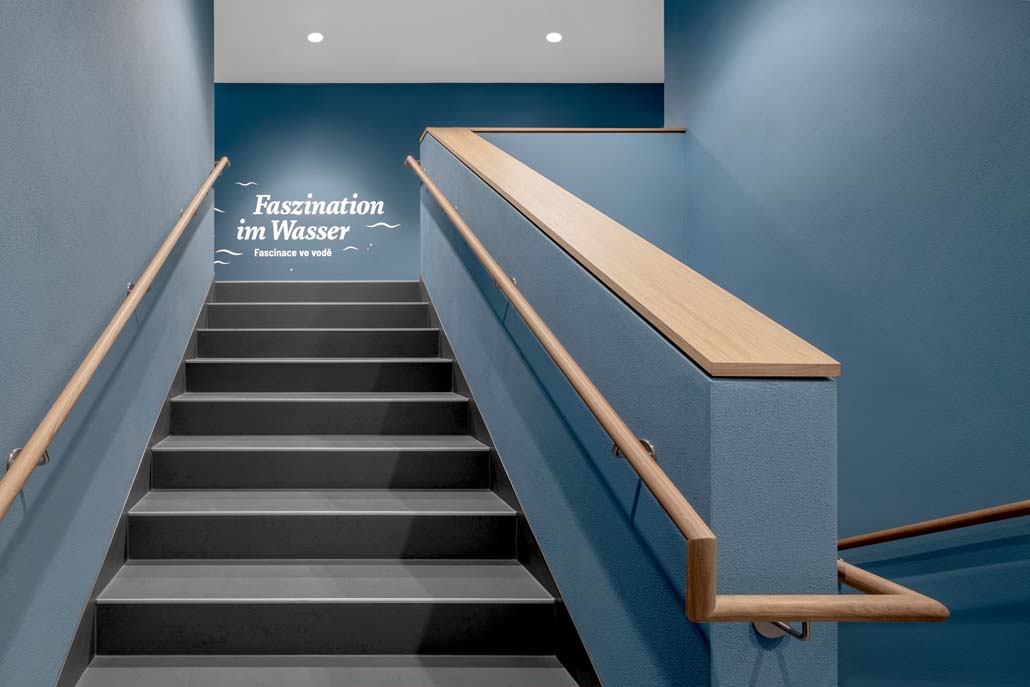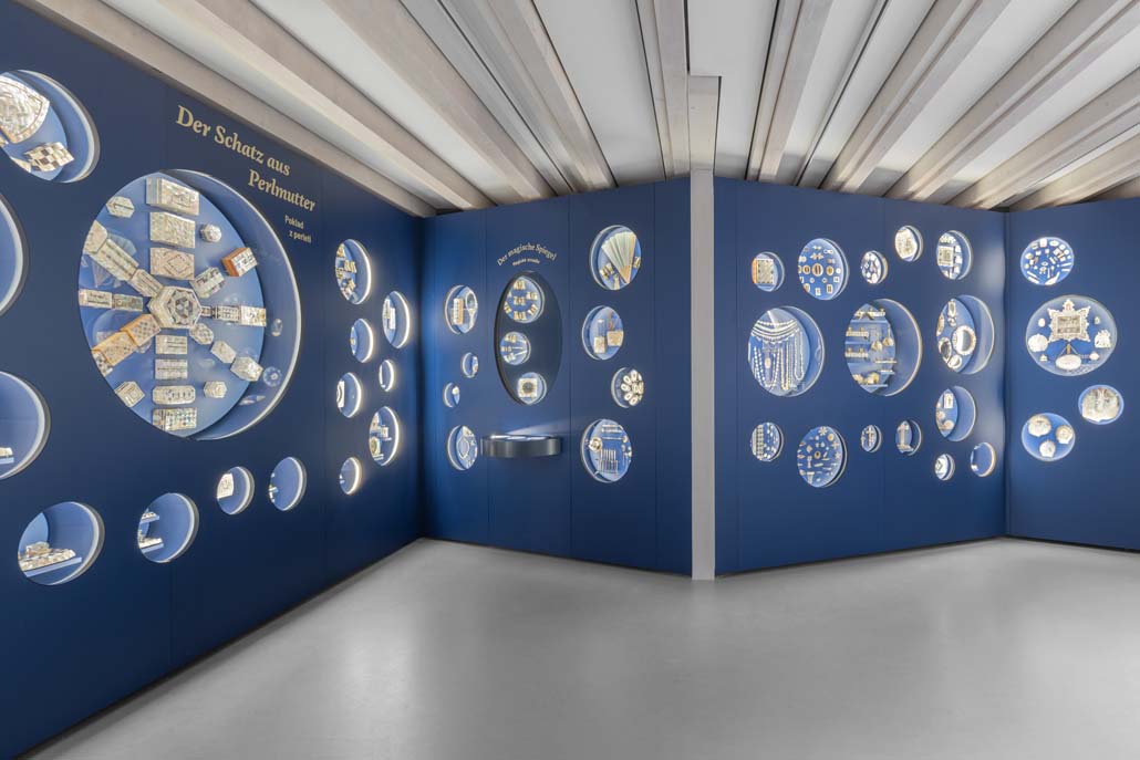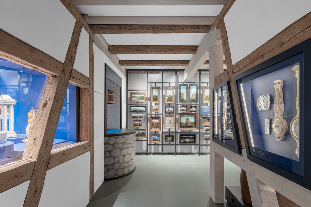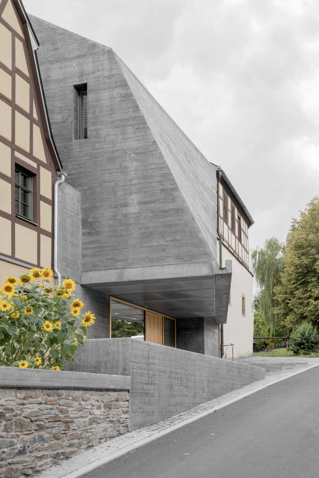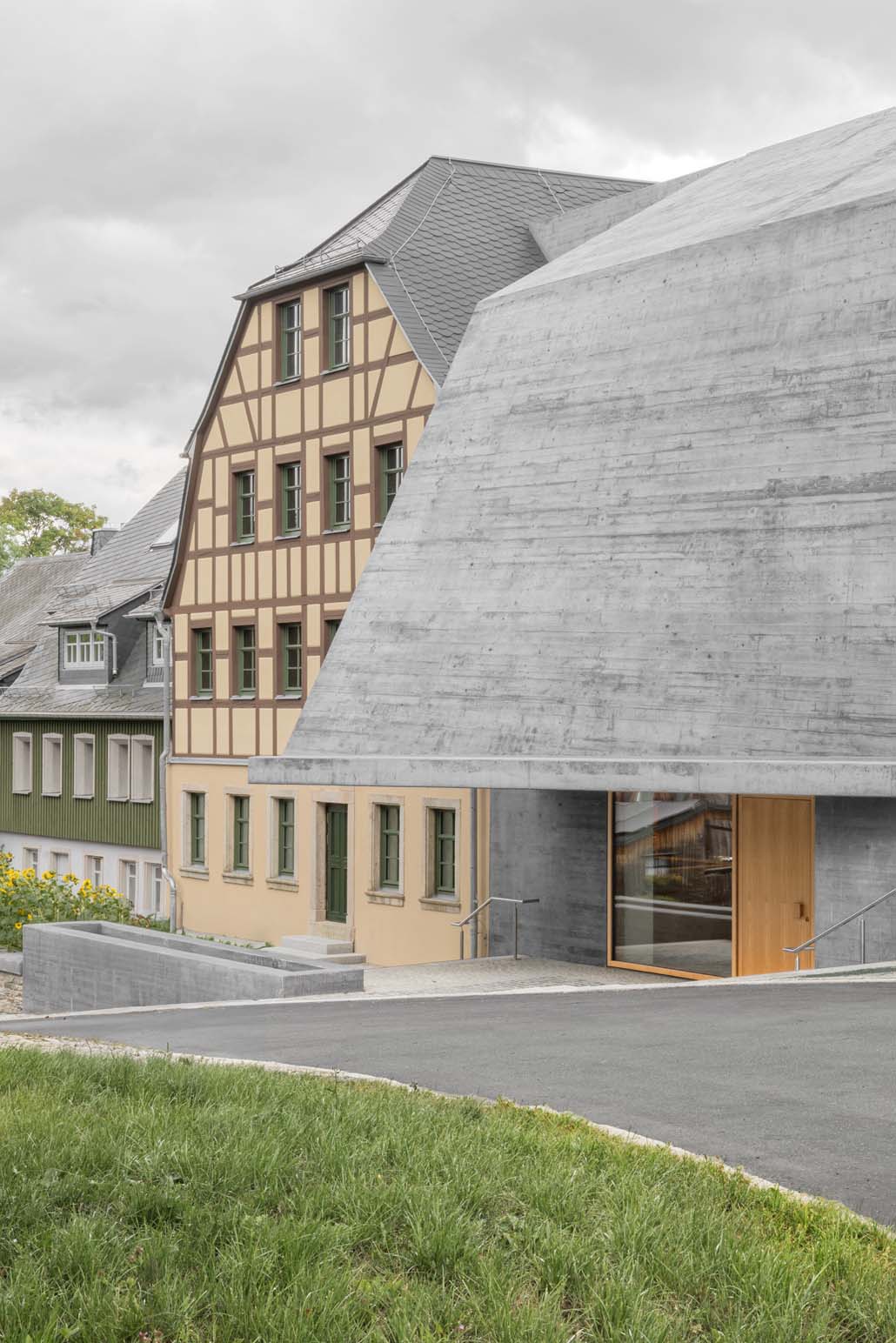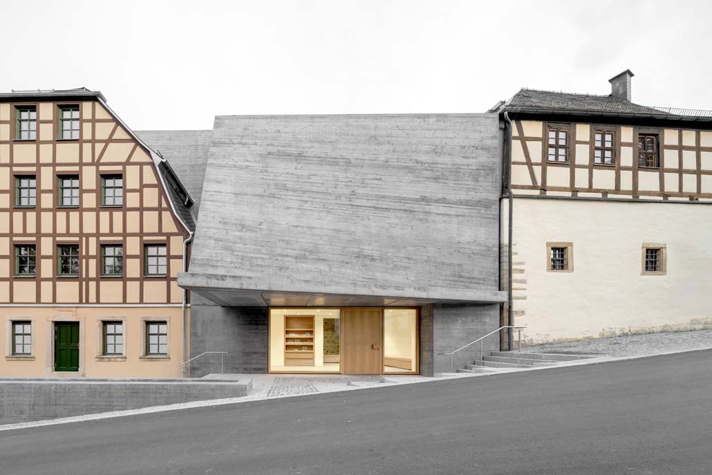 Das neue Eingangsgebäude mit seiner skulptural verformten Betonschale verbindet zwei historische Fachwerkhäuser. Die Fassade transformiert das Bild einer Muschelschale – mit rauer Schale und kostbarem Inneren als gestalterischem Leitmotiv. Wasser fließt kontinuierlich über die Betonschale in einen Brunnen und verweist so auf fließendes Wasser als Lebensgrundlage der Muschel.