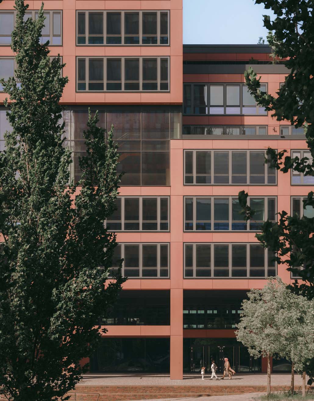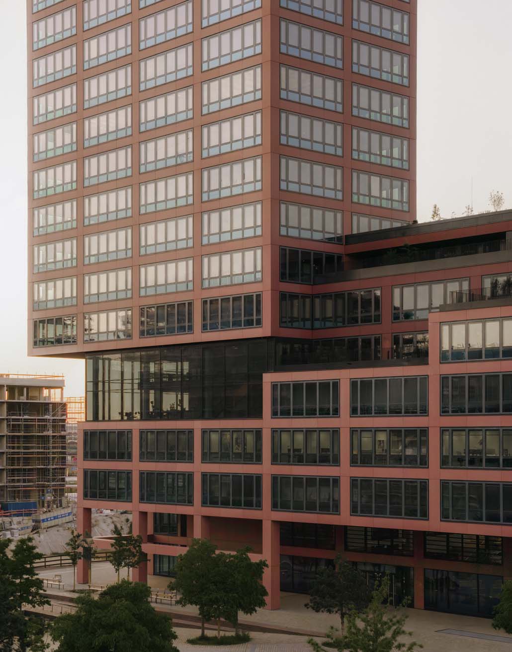 So wie sich das EDGE HafenCity mit seinem offenen und vielfältigen Konzept mit dem sozialen Umfeld vernetzt, fügt sich seine rote Fassade visuell in das städtebauliche Gefüge der östlichen HafenCity ein. Alle Dachflächen des Gebäudes sind als Retentionsdächer ausgebildet und größtenteils intensiv begrünt. Das Turmdach ist mit Photovoltaik-Paneelen zur Stromversorgung ausgestattet.