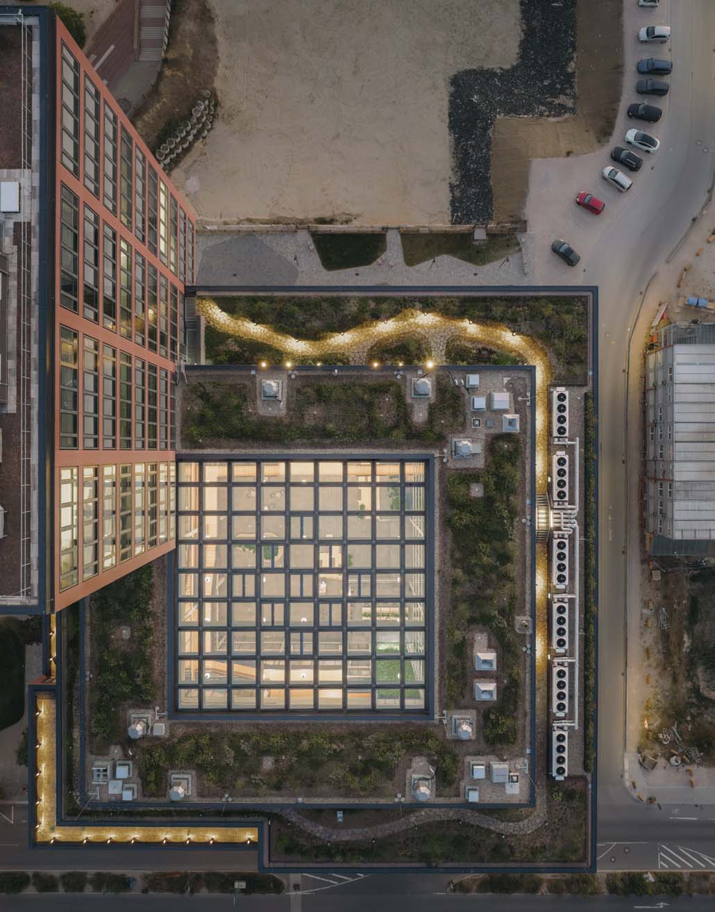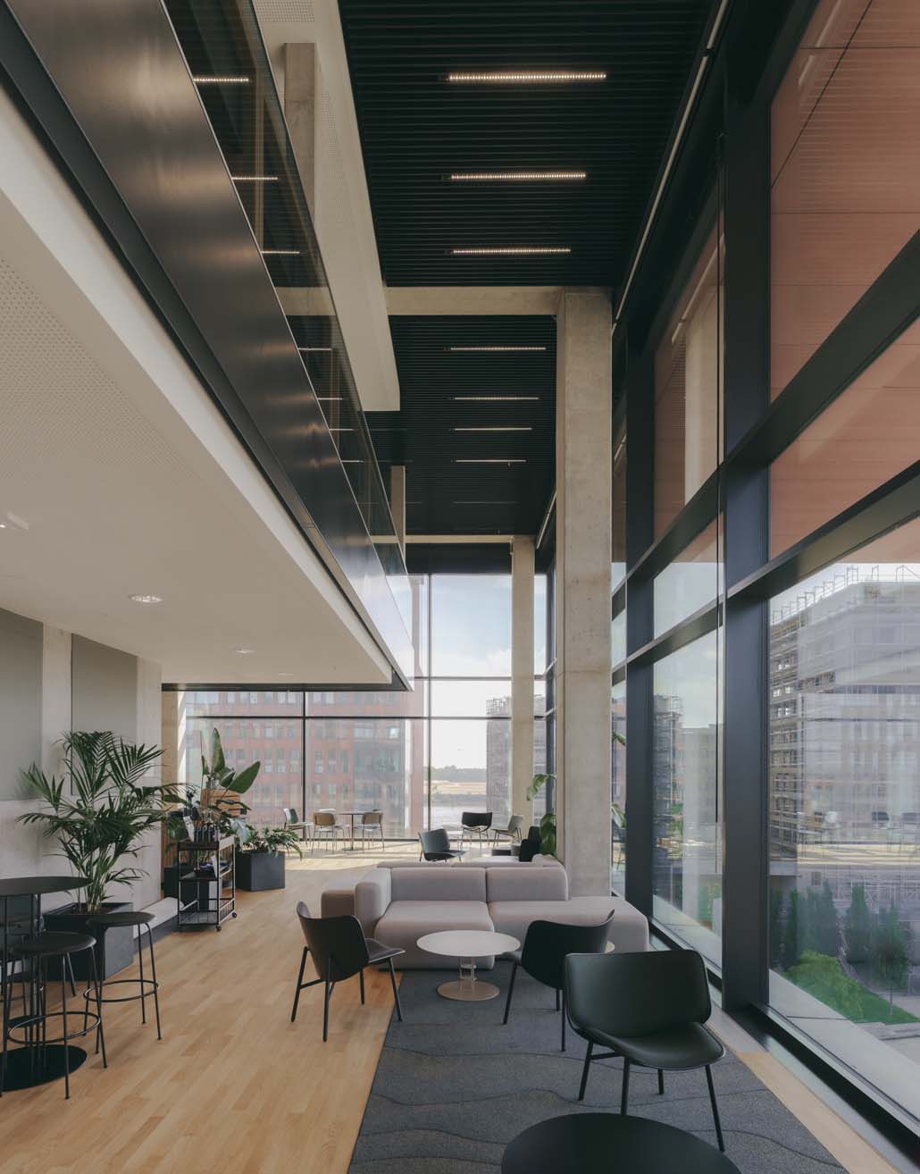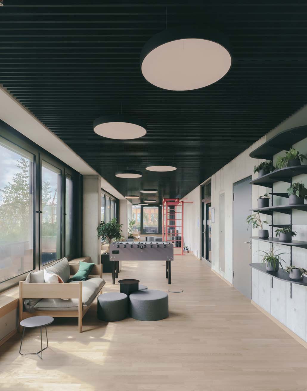 Im Erdgeschoss befinden sich Gastronomie- und Konferenzbereiche, in den Obergeschossen die mietbaren Büroflächen mit Zonen für kollaboratives und konzentriertes Arbeiten. Sie stehen allen Mieter*innen als gemeinsame Aufenthaltsbereiche zur Verfügung. Ebenso die umlaufende, üppig bepflanzte Dachterrasse, die der Erholung dient.